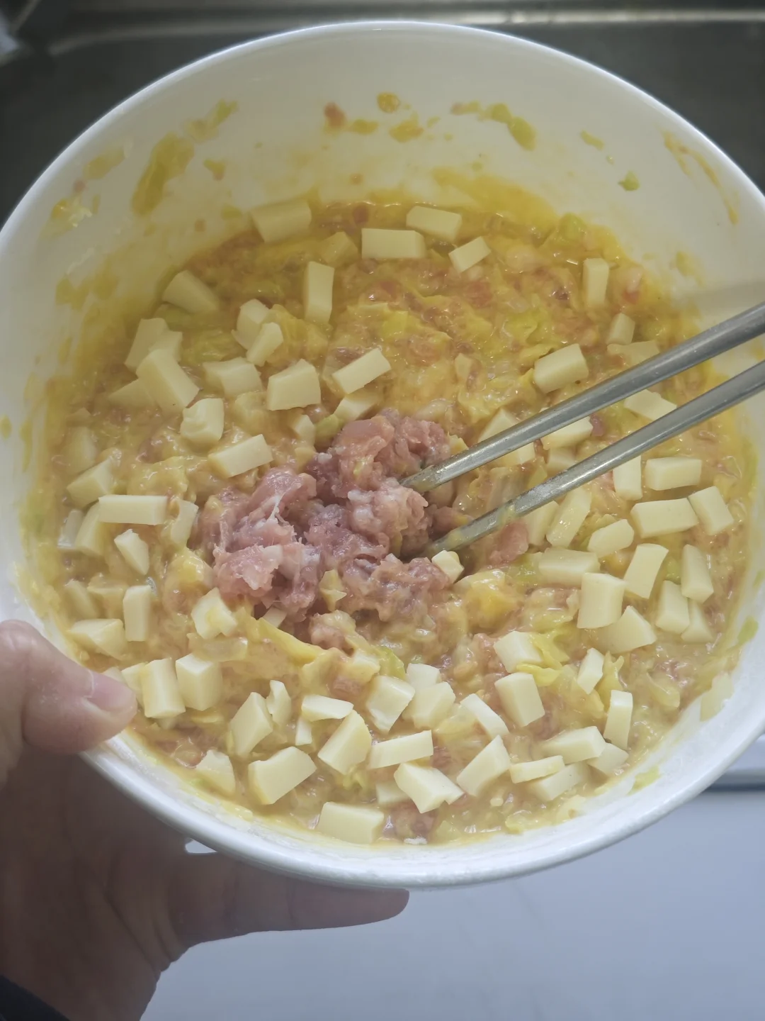 猪肉末|包菜碎|鸡蛋2个|少许面粉|🧀奶酪丁