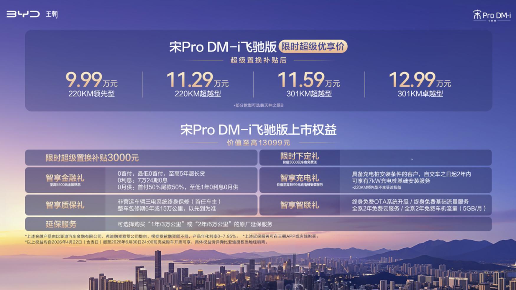 比亚迪这次真的让家用插混 SUV 市场重新洗牌,宋 Pro DM-i 飞驰版正式上市,限时 9.99 万起的定价,直接把 220km 纯电续航车型拉入 9 万级,性价比直接拉满。新车提供 220km 和 301km 两个续航版本,301km CLTC 纯电续航足够覆盖日常两周通勤,市区代步完全可以当纯电车用,实现通勤零油耗。满油满电综合续航达到 1735km,亏电油耗仅 3.2L,长途出行没有任何焦虑。驾控与安全层面搭载云辇‑C、TSC、天神之眼 C 组成的 3C 神装,还新增高速爆胎稳定控制系统,高配可选激光雷达,智驾能力大幅提升。车内配备一体式冷暖冰箱、座椅通风加热按摩、方向盘加热等舒适配置,实用性拉满。背靠百万用户口碑,再加上全面升级的产品力与诚意定价,这台车无疑是今年家用插混 SUV 里最值得关注的车型,真正做到以亲民价格带来越级体验。