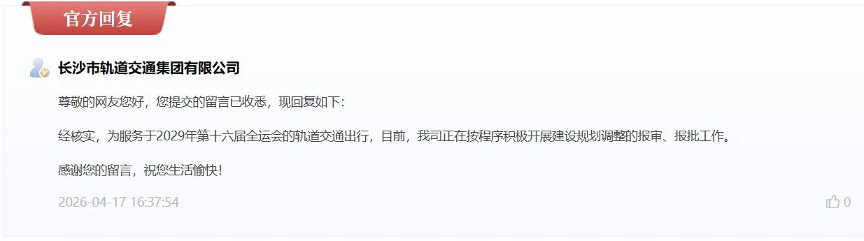 根据官方发布的回复内容,为全力保障2029年第十六届全运会的轨道交通出行服务,目前长沙轨道集团正按程序积极开展轨道交通建设规划调整的报审、报批工作。这一官方表态,也让此前关于5号线南延线优化延伸的市场猜测,有了明确的官方进展回应。