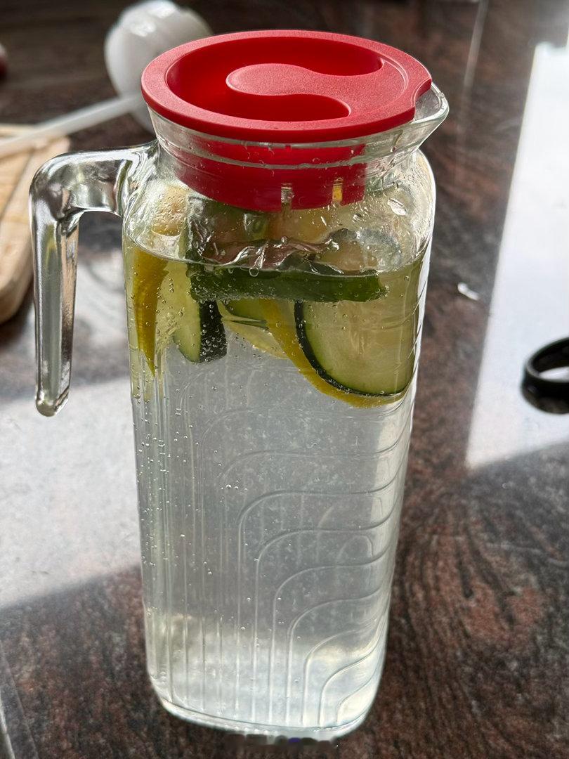 切几片黄瓜和几片柠檬,再挤出剩下的柠檬汁。手撕几片薄荷或者罗勒叶子。一壶水放在冰箱,一杯1.2L的Stanley水壶。一天喝完。正好用完一个柠檬🍋