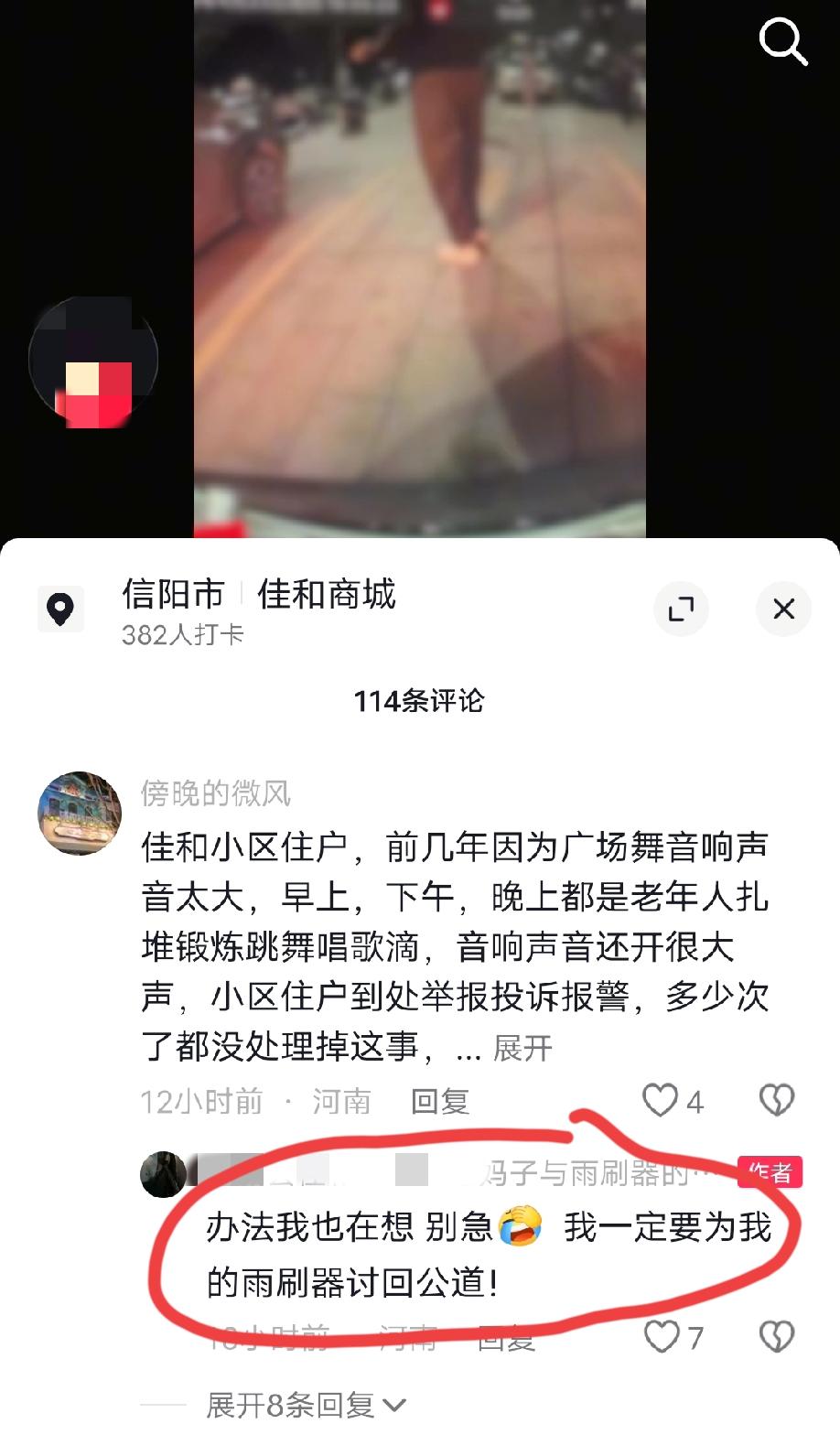 4月24日,河南商城。网友发视频称,自己去佳和广场健身,一群广场舞大妈占着路面无法停车,于是长按喇叭,遭大妈无声抗议。有一个大妈假装漫不经心,边跳舞边往我车上靠,后来有人告诉我后面有个车位,于是我就倒车去停车了。倒车时大妈没靠住,一屁股坐在地上。等我健完身下来,发现雨刮器被人掰了……