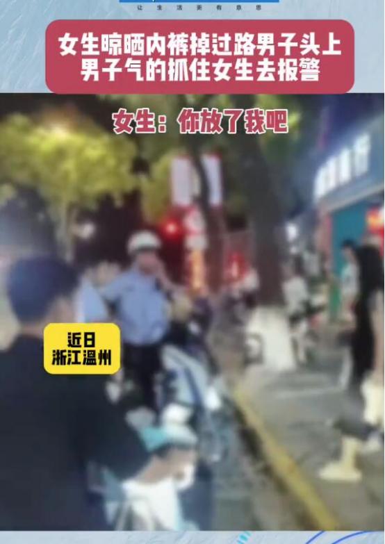 笑不活了!浙江温州,女孩晾晒内裤的时候,一不小心手滑了,内裤掉到了楼下,结果正好一位男人路过,好巧不巧掉到了他的头上,女孩下来捡的时候,男人气急败坏,拉住女孩不让其走开,并且报警,女孩求放过。