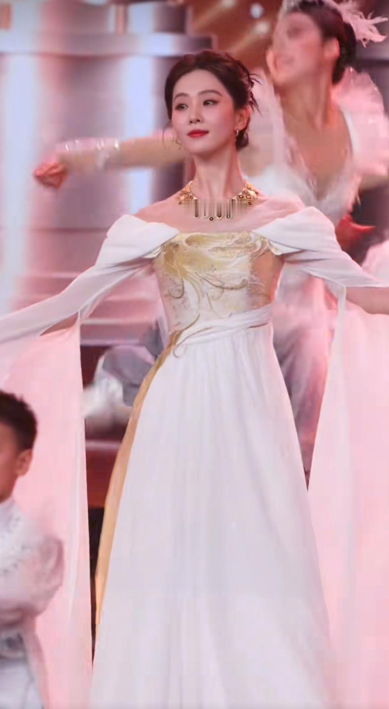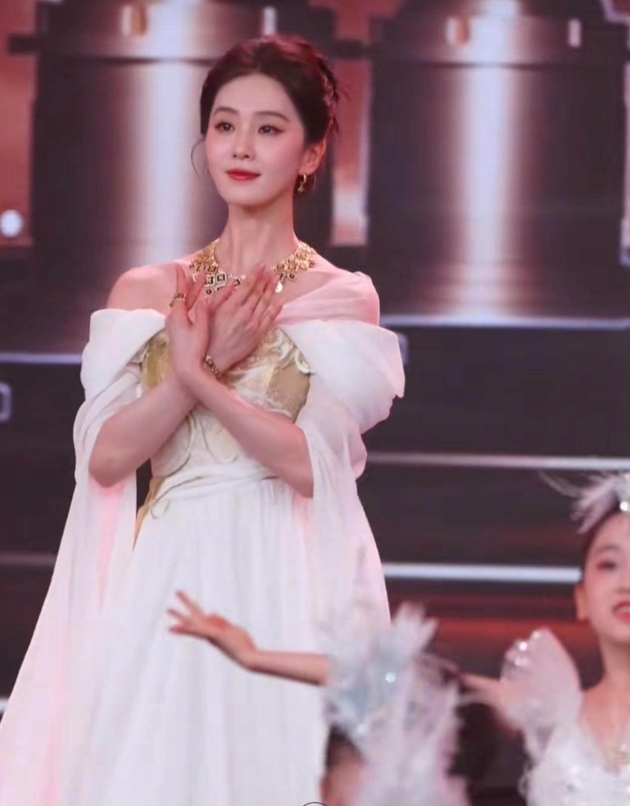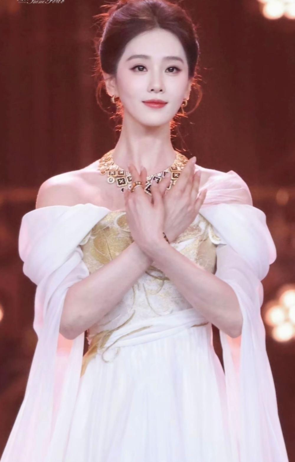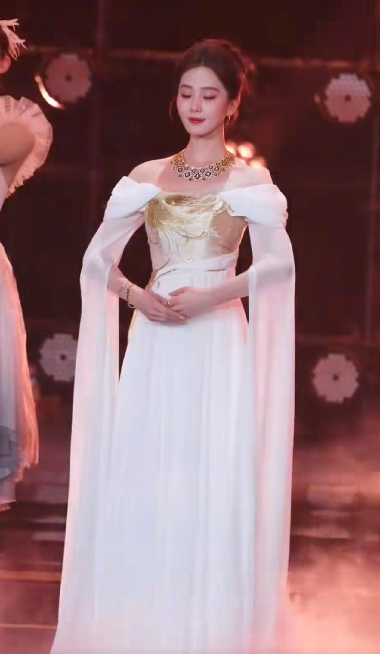 一袭仙气白纱鎏金礼裙登场,直接把东方神女氛围感拉满,真正诠释了什么叫天女下凡。