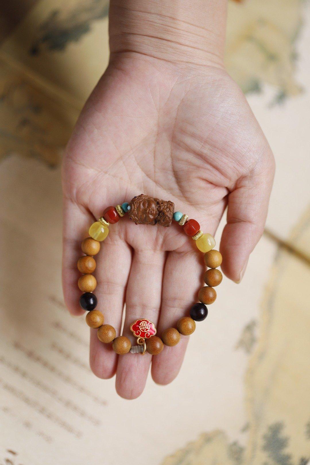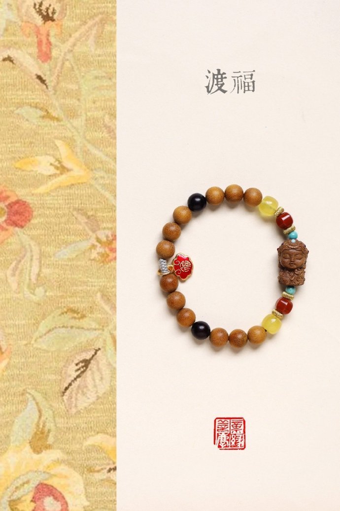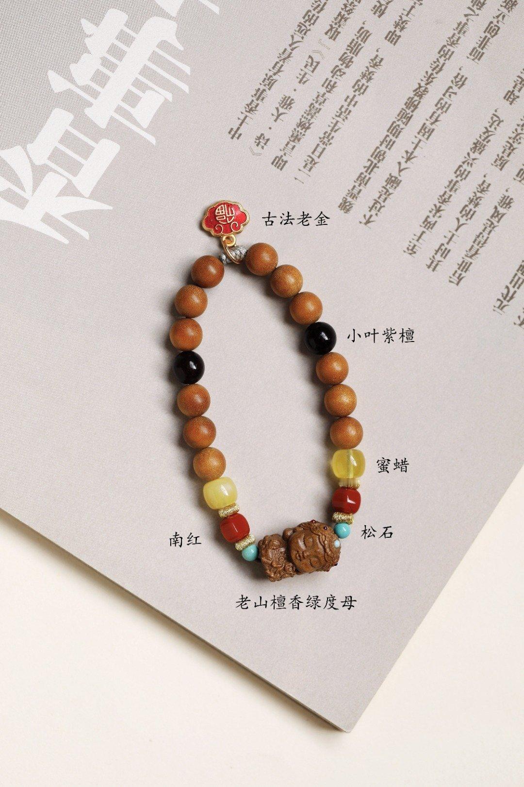 老山檀香香韵醇厚,气质优雅,南红、蜜蜡等为饰,尤为点睛;余香绕腕,闻之舒心。
