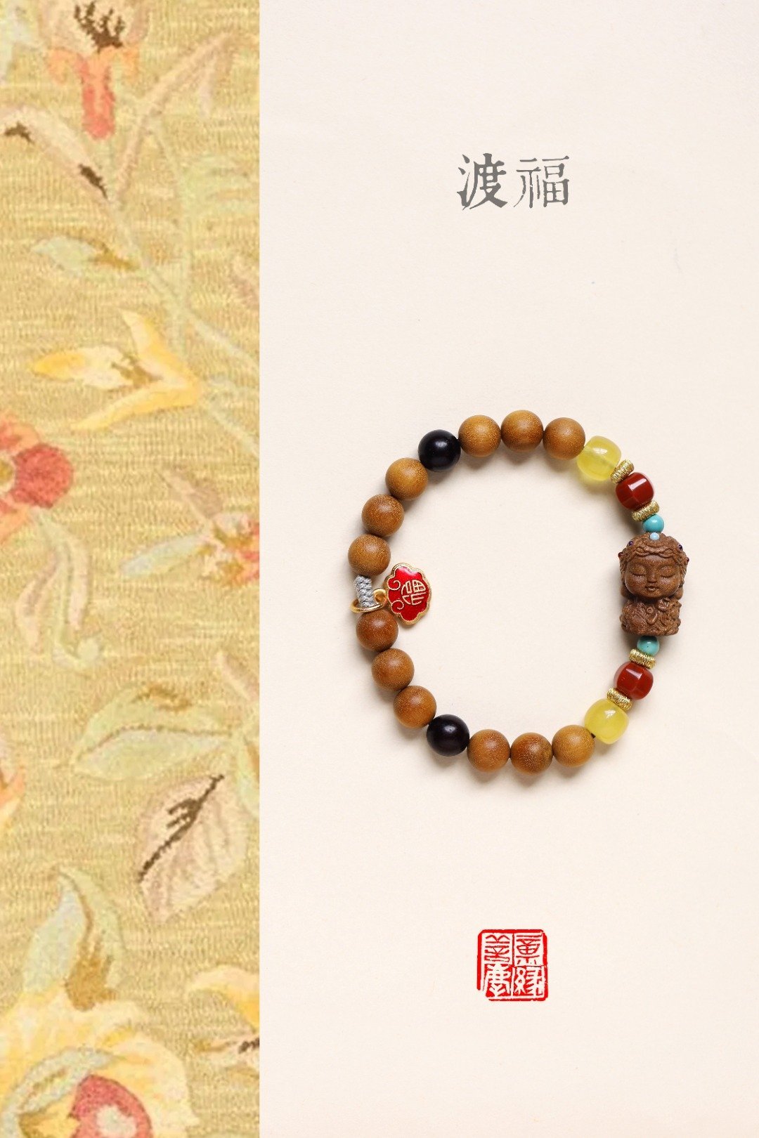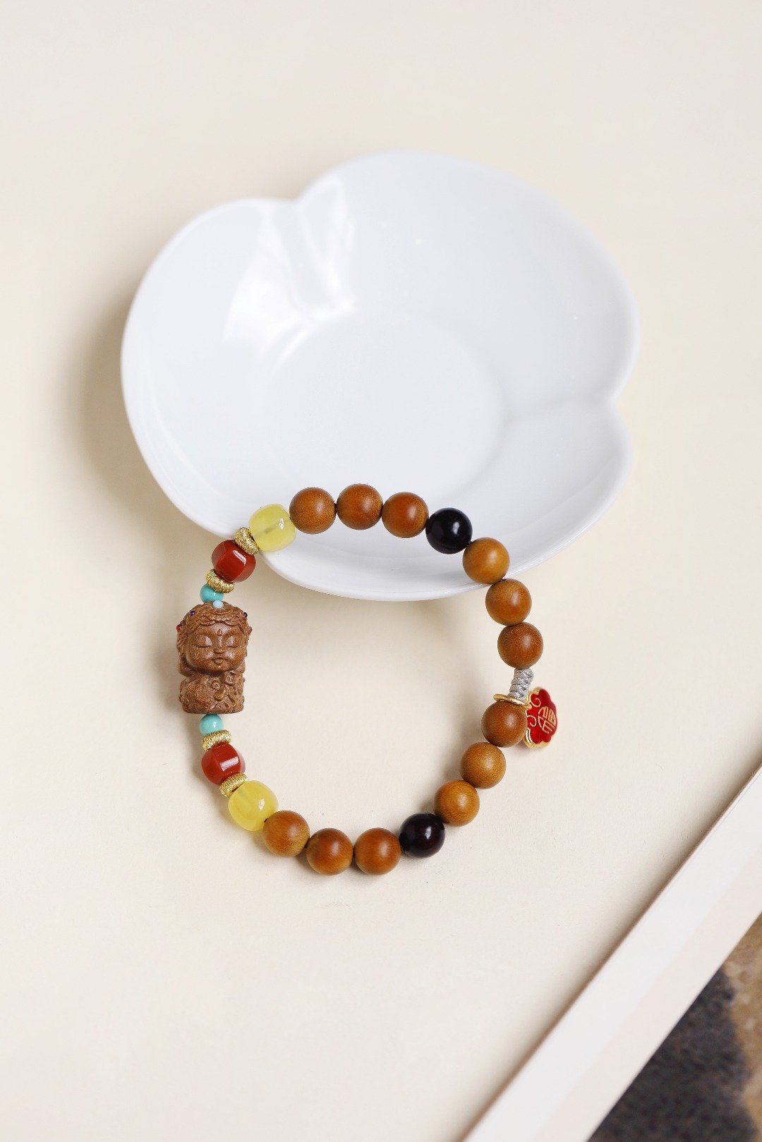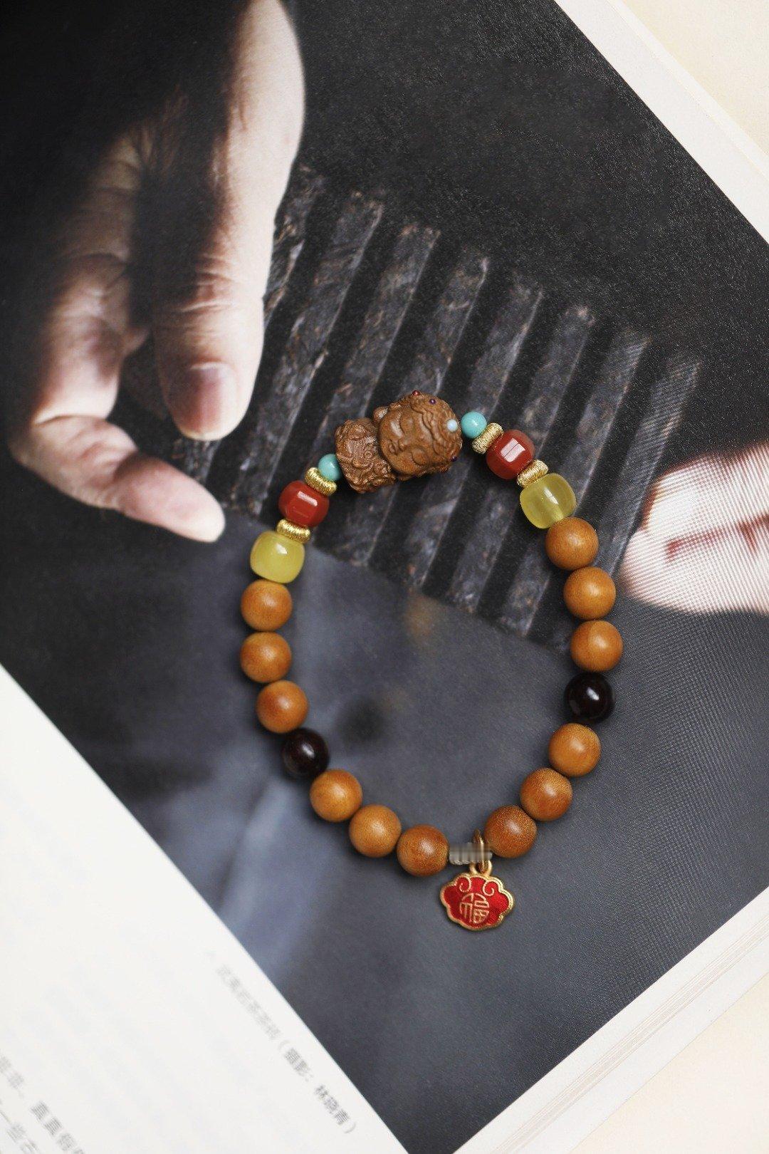 老山檀香香韵醇厚,气质优雅,南红、蜜蜡等为饰,尤为点睛;余香绕腕,闻之舒心。