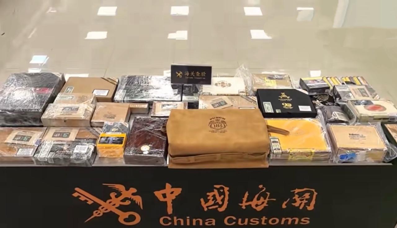 只见男子行李箱里装满各种雪茄,包装不同,规格不一,摆满了查验台,有415支,值16万元。