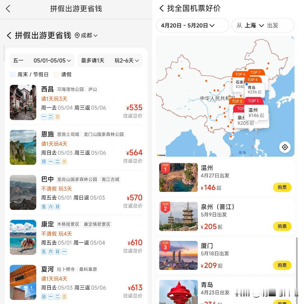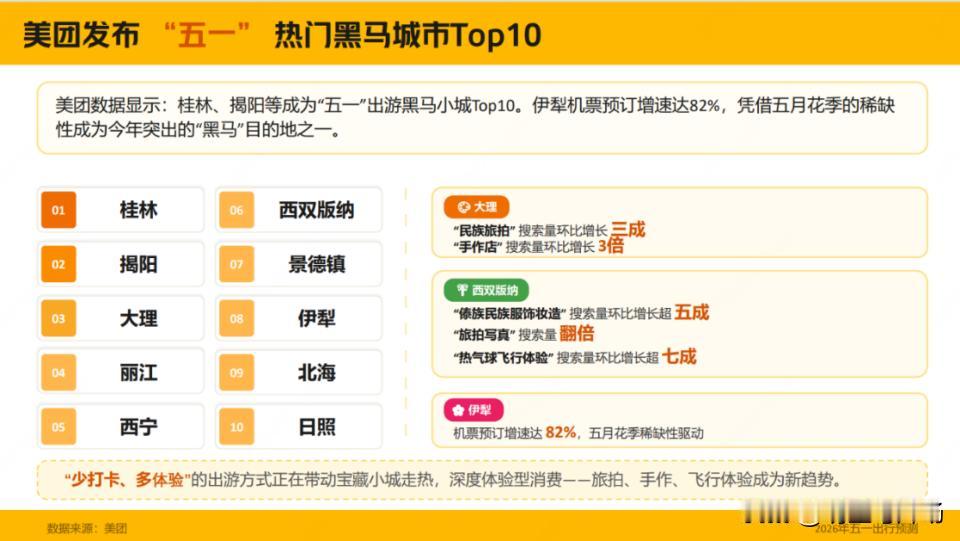 说到宝藏小城,今年Top 10的热门目的地里有成都、重庆、昆明,这座充满松弛感的西南城市魅力依旧不减。但最让我眼前一亮的是 “宝藏小城” 们的集体领跑。像山水甲天下但处处是惊喜的桂林、热带风情满满的西双版纳,还有五六月变成绿色海洋大草原的伊犁,这些地方的热度增幅非常亮眼。