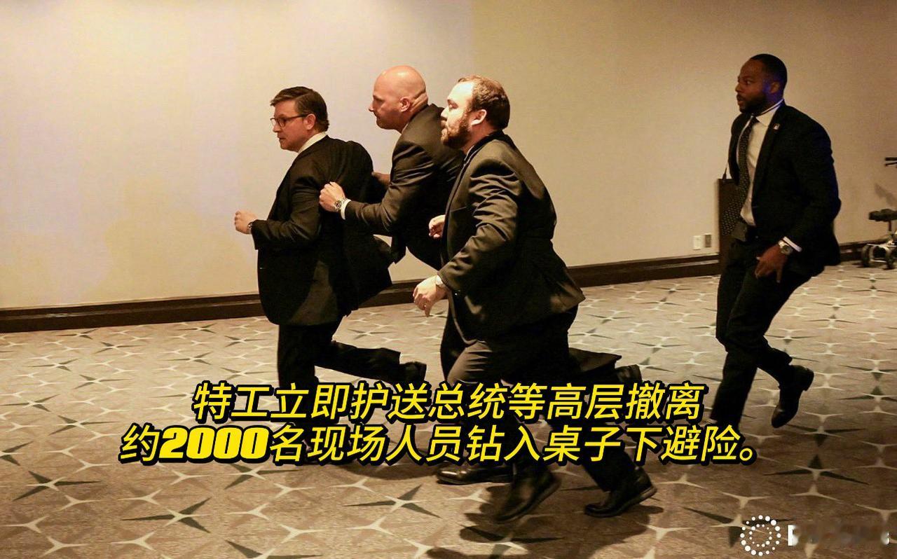 特勤局特工立即护送总统和副总统等高层撤离,约2000名现场人员钻入桌子下避险。
