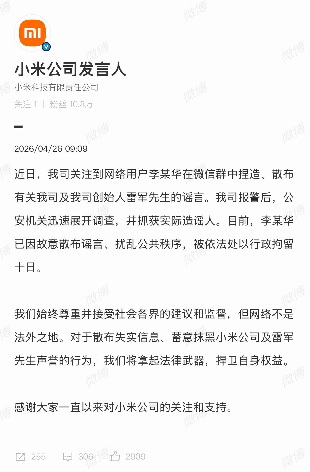 网友造谣雷军被行拘10天没脑子的后果道歉也没用。