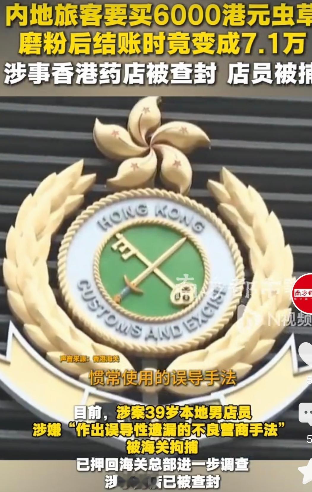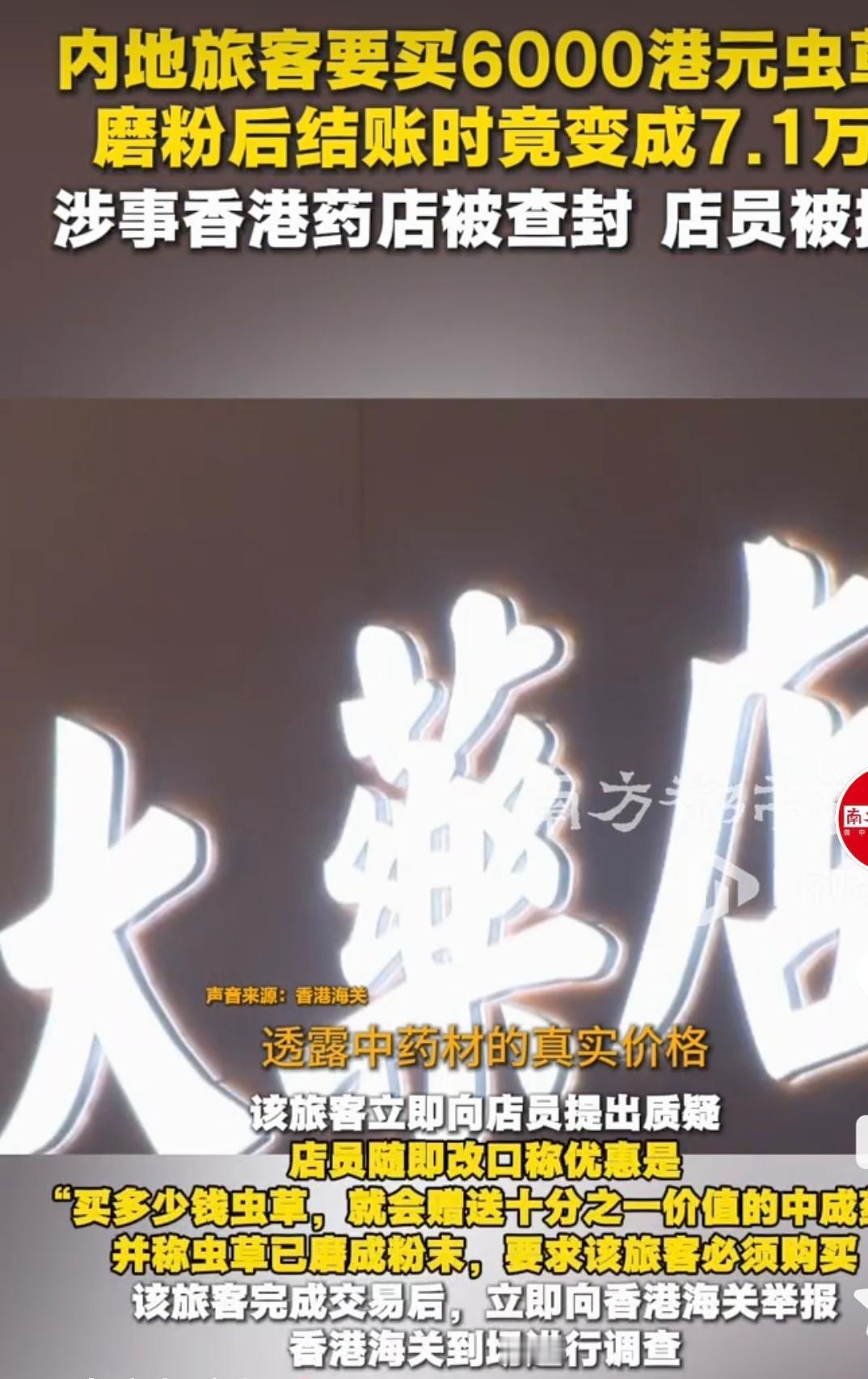 香港,一内地游客在香港到旺角艺创大药房购物,39岁的店员说,店铺促销,只要买虫草,就可以获得相同价值的中成药产品,游客再三确认后,要求购买6000元虫草,结果店员将虫草磨成粉后,向游客收71400港元,为原价的近12倍,这个价格超出游客的预期太多了,游客提出质疑,店员又改了说法,并称虫草磨成粉了,要求游客必须购买,该游客知道其中肯定有猫腻,支付完后既向香港海关举报,海关的处理结果真的大快人心啊!
