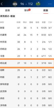 整场比赛,哈达威以替补身份出战27分钟,出手10次只命中3球,命中率仅30%,其中最关键的三分球,6次出手全部打铁,一分未得,唯一的得分亮点就是罚球5中4,最终低效拿到10分,还出现了2次失误。