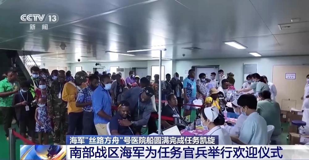 上午10时,南部战区海军为任务官兵举行了欢迎仪式,南部战区海军领导、官兵代表及任务官兵家属在码头迎接。