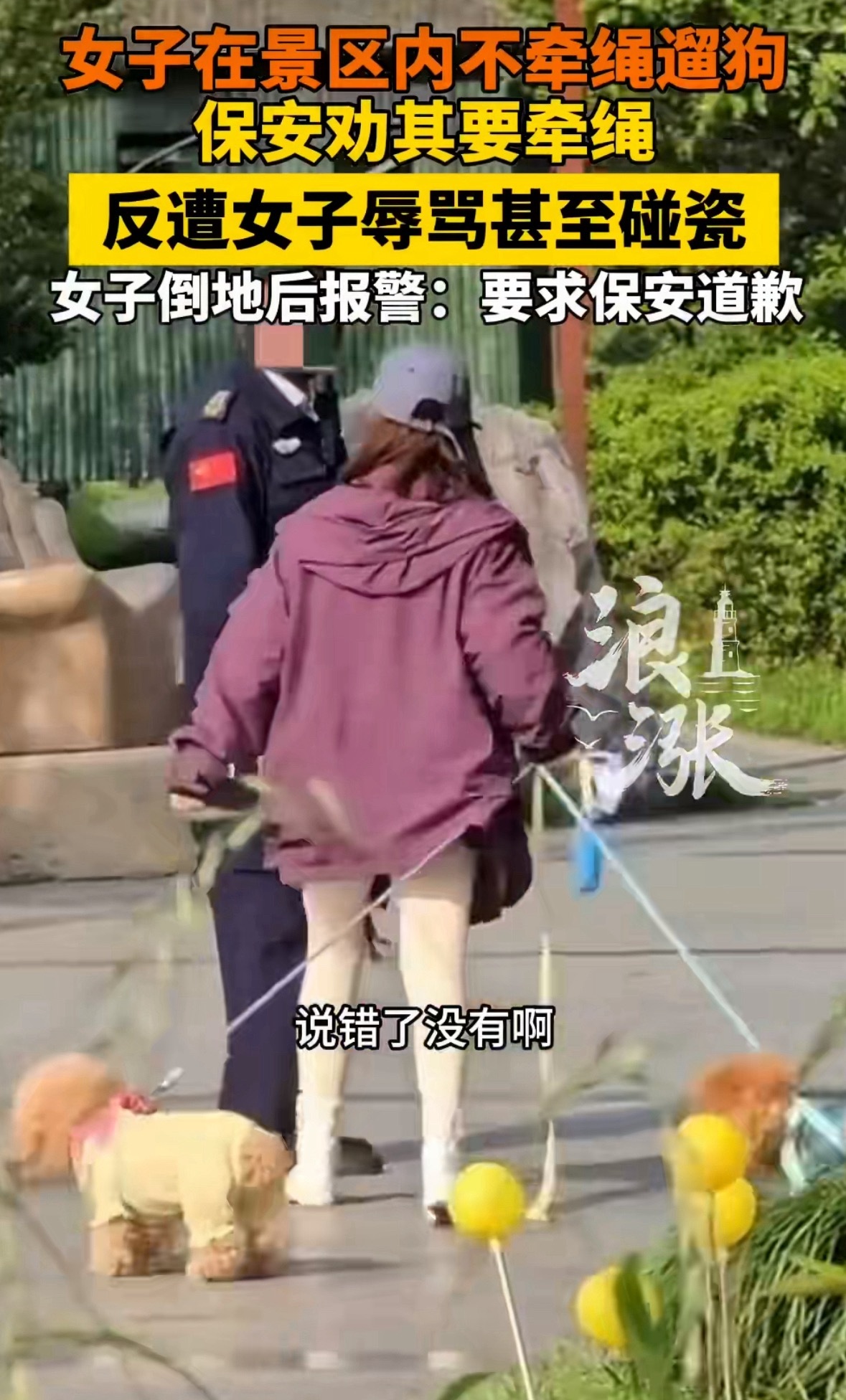 保安劝女子遛狗牵绳反遭辱骂碰瓷公共场合,遛狗不栓绳,民警返场后,仍无理取闹