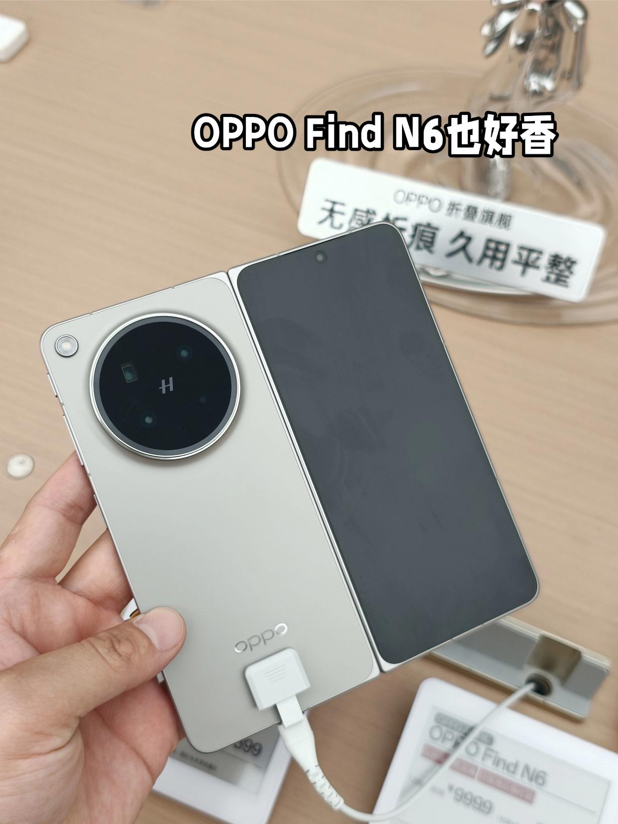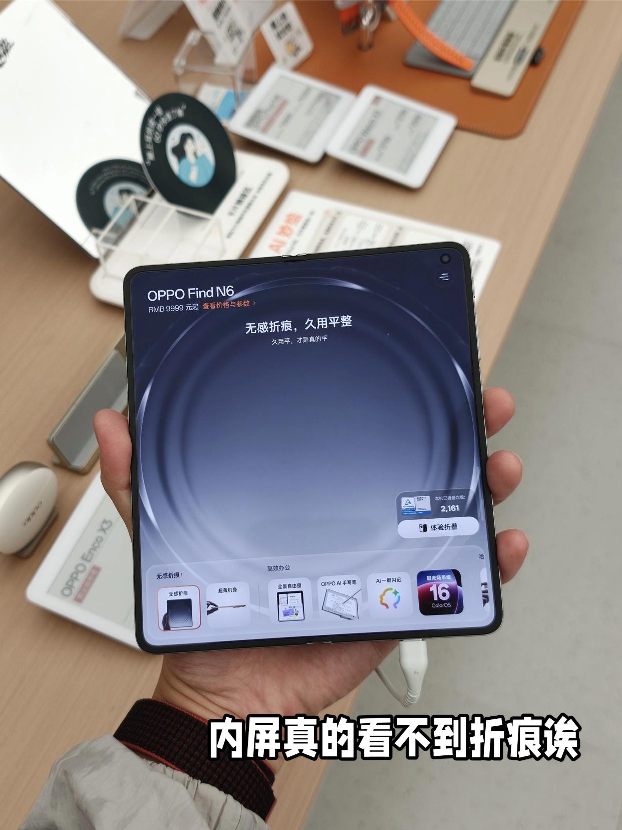 然后去隔壁看了下OPPO Find N6,比较便宜嘛,而且最近也挺火的。上手试了试,感觉质感也挺不错的,店员跟我说ColorOS 16用来办公很不错,分屏很方便,一边办公还能一边摸鱼