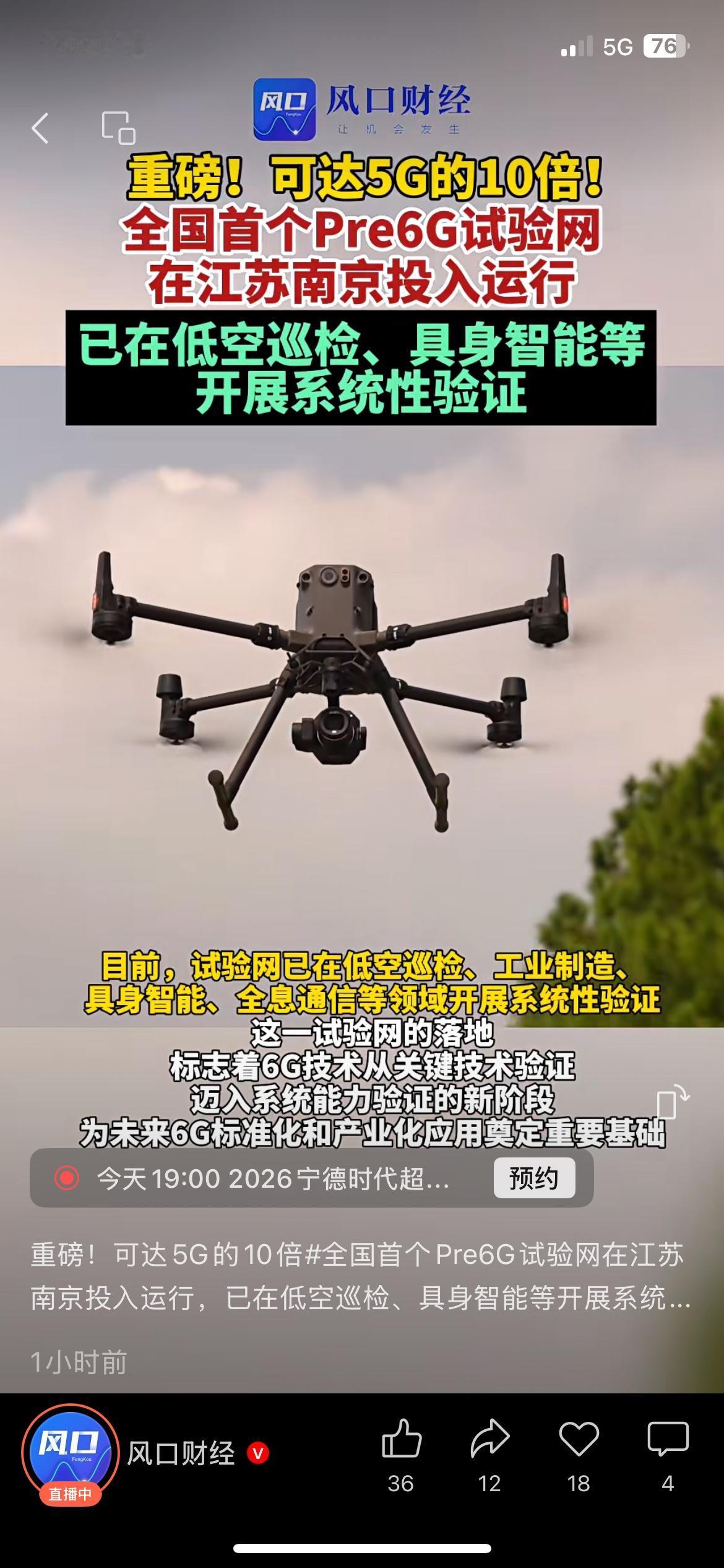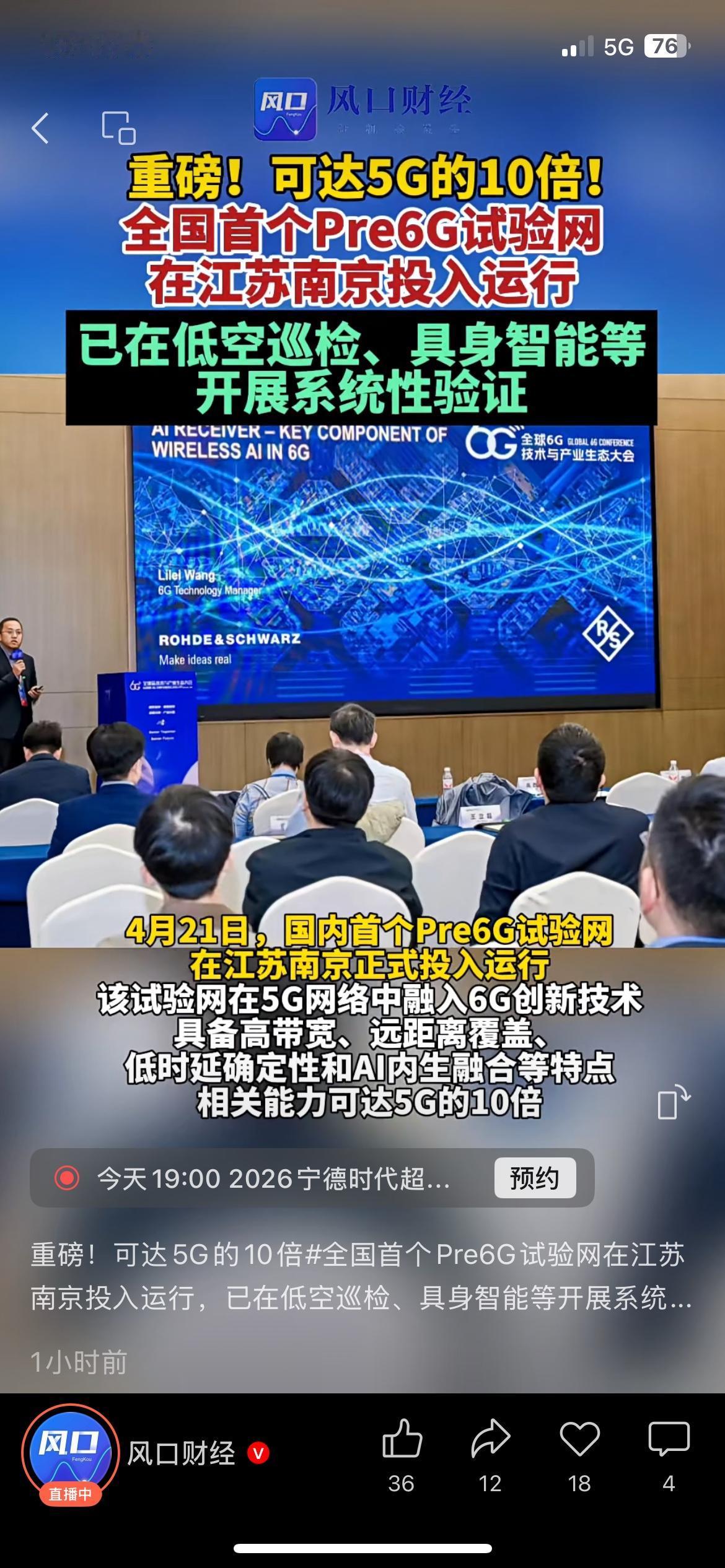 全国第一个Pre6G试验网在南京正式运行,网速能达到5G的10倍左右。