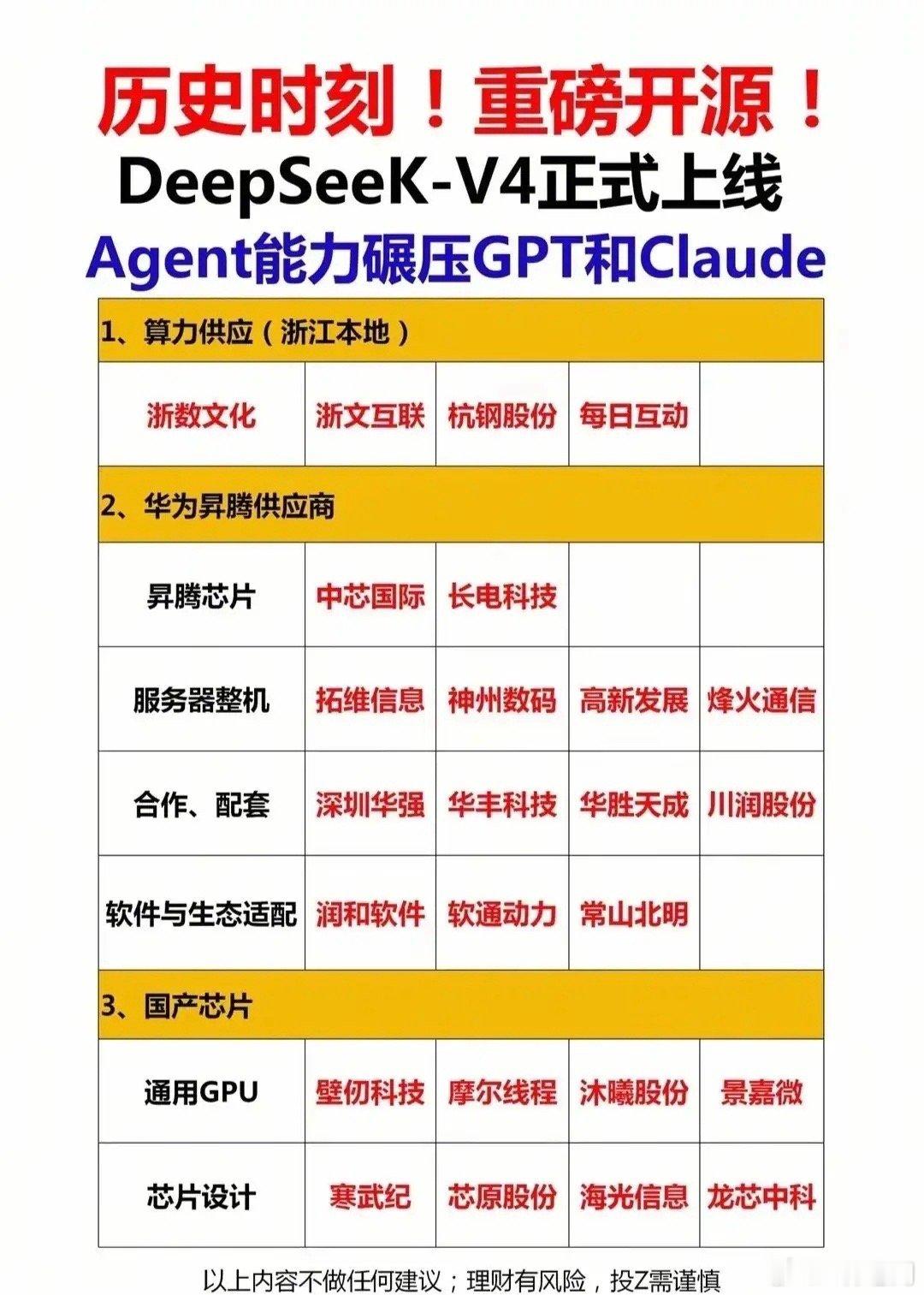 周末重磅炸场,各种利好来袭这些热门题材概念值得关注!市场从不缺风口,缺的是能提前看懂主线的眼睛!✅ 苏州光链军团:中际旭创、天孚通信等25家顶流扎堆,AI算力光模块、CPO、高速器件全链条领跑,光模块新股上市首日暴涨800%,一签狂赚40万,站在“光”里的苏州,正在定义AI算力的中国高度。✅ 商业航天新赛道:中国卫星、中国卫通、博云新材等10家企业订单爆量,一季报最高暴增14349%,低轨卫星互联网、星箭配套全产业链爆发,下一个10倍风口已在路上。✅ 国产AI硬核突围:DeepSeek-V4携华为昇腾全栈适配国产芯片,半导体设备、材料、芯片、封装全链条国产替代加速,北方华创、中芯国际、寒武纪等核心企业集体发力,国产算力生态彻底打通。✅ 一季报业绩炸弹:超40家公司净利翻倍,最高暴增79倍!飞南资源、派瑞股份、招商轮船等业绩全线飘红,高景气赛道的赚钱效应正在兑现。从AI算力的“光”,到商业航天的“星”,再到国产芯片的“芯”和业绩兑现的“实”,四大主线共振,市场的新方向已经清晰。⚠️ 郑重提示:以上内容仅为市场公开信息整理,不构成任何投资建议。股市波动风险极高,所有标的均不做买卖推荐,投资请务必独立判断、理性决策。