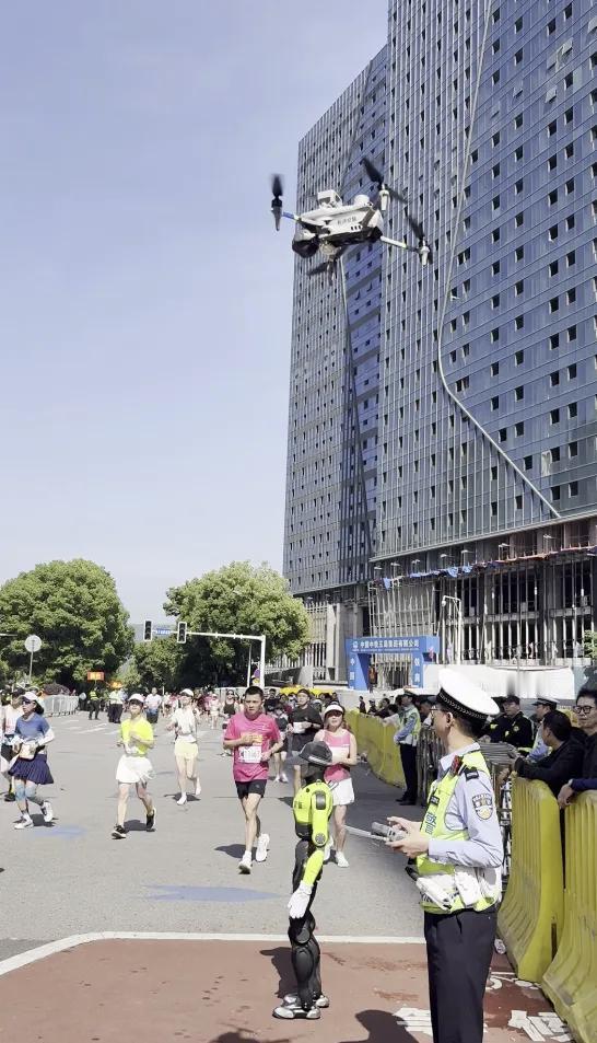 除了管控模式上的暖心创新,本次赛事的交通保障工作还注入了满满的科技力量。多款智能交通机器人正式上线执勤,化身路面上的“智能帮手”:既能配合现场警力规范开展交通指挥,高效疏导人流、维护现场通行秩序,也能循环开展文明出行劝导,实时提醒市民遵守现场管控要求,在安全区域有序等候过街。与此同时,长沙交警还依托高空巡逻设备、交通态势精准研判分析系统,提前预判沿线车流人流变化趋势,及时填补管控盲区,不仅大幅提升了交通管控的精准度与响应效率,也有效弥补了路面警力的覆盖缺口,让赛事保障工作更智能、更高效。