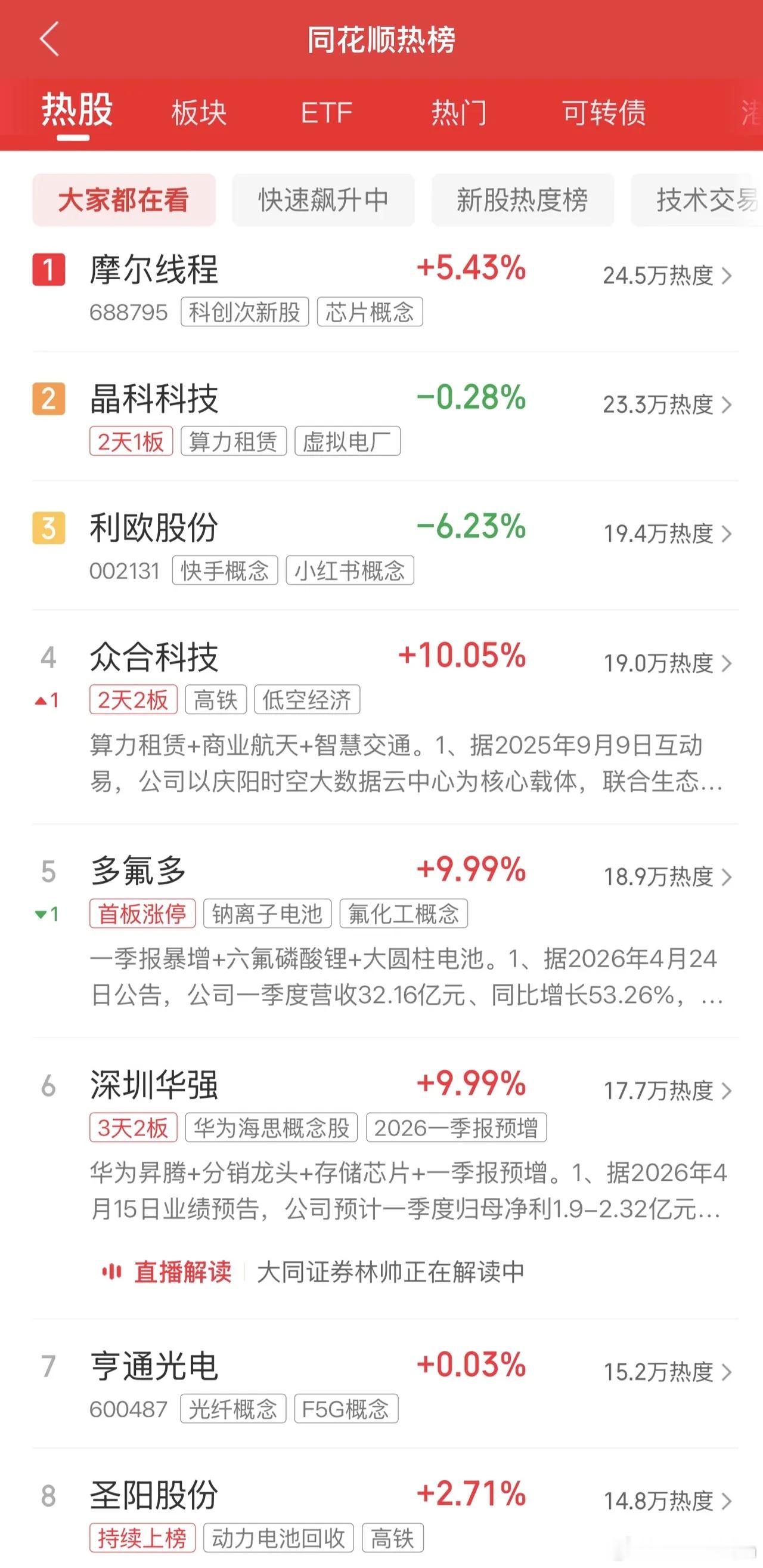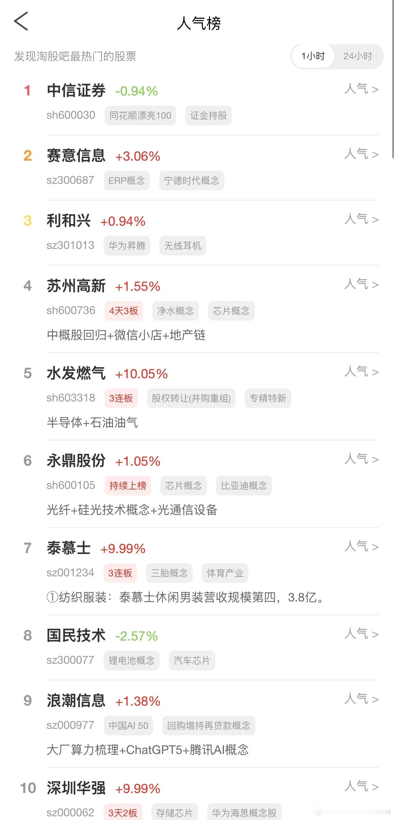 2026年4月26日,各大股吧前十热股:淘股吧: 1.中信证券 2.赛意信息 3.利和兴 4.苏州高新 5.水发燃气 6.永鼎股份 7.泰慕士 8.国民技术 9.浪潮信息 10.深圳华强 东财吧: 1.多氟多 2.江特电机 3.深圳华强 4.拓维信息 5.天通股份 6.恩捷股份 7.众合科技 8.亨通光电 9.华电能源 10.浙数文化 同花顺: 1.摩尔线程 2.晶科科技 3.利欧股份 4.众合科技 5.多氟多 6.深圳华强 7.亨通光电 8.圣阳股份 9.神剑股份 10.拓维信息