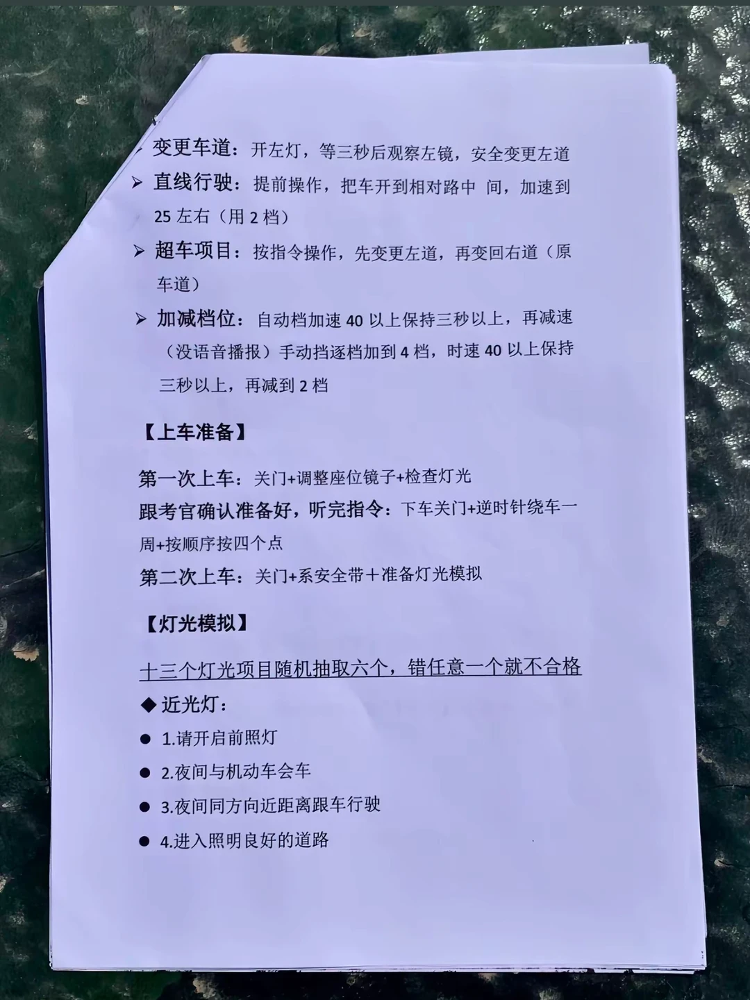 >上车准备:调整座椅镜子,复位灯光,绕车一周灯光模拟:十三个灯光随机抽取六项