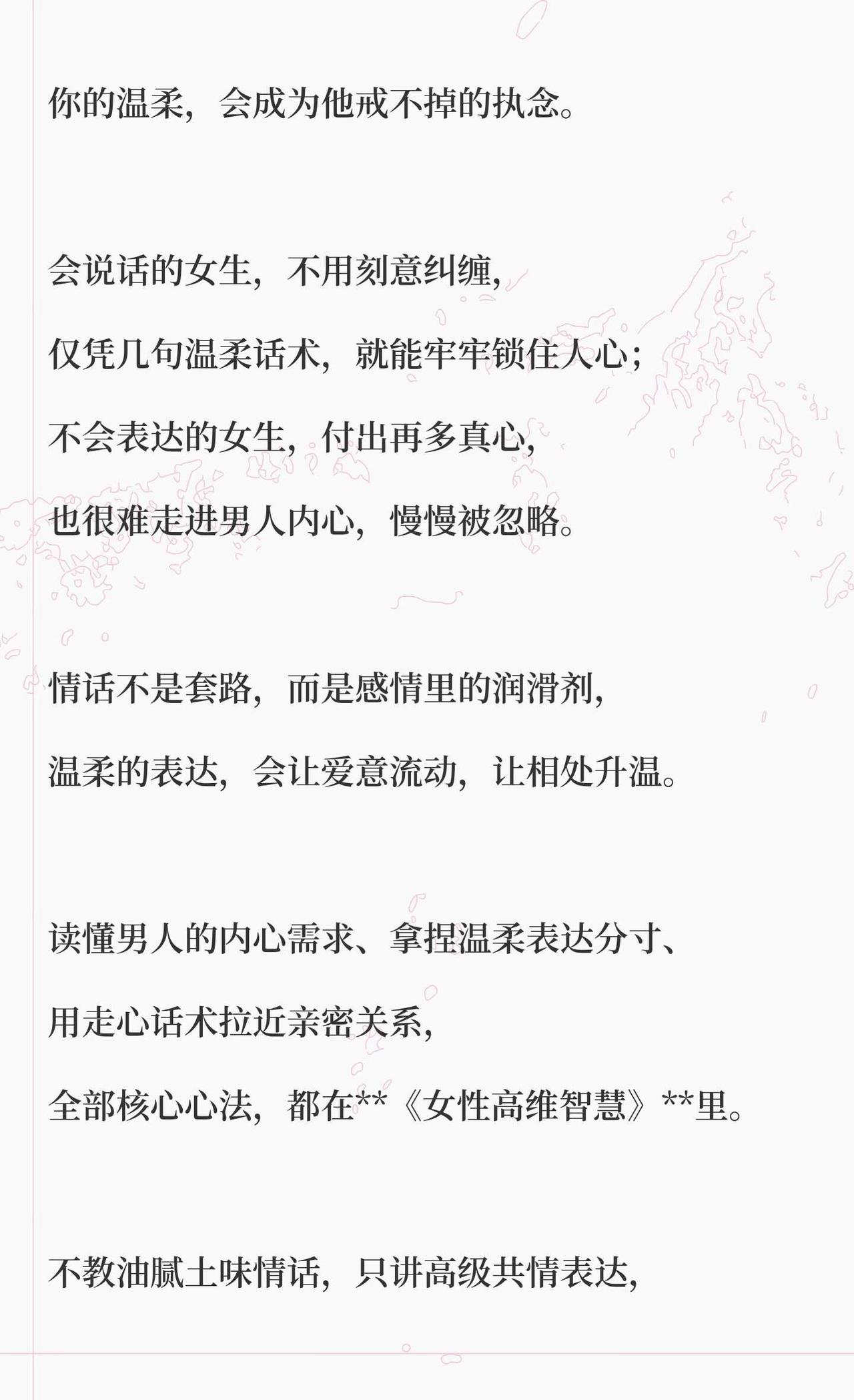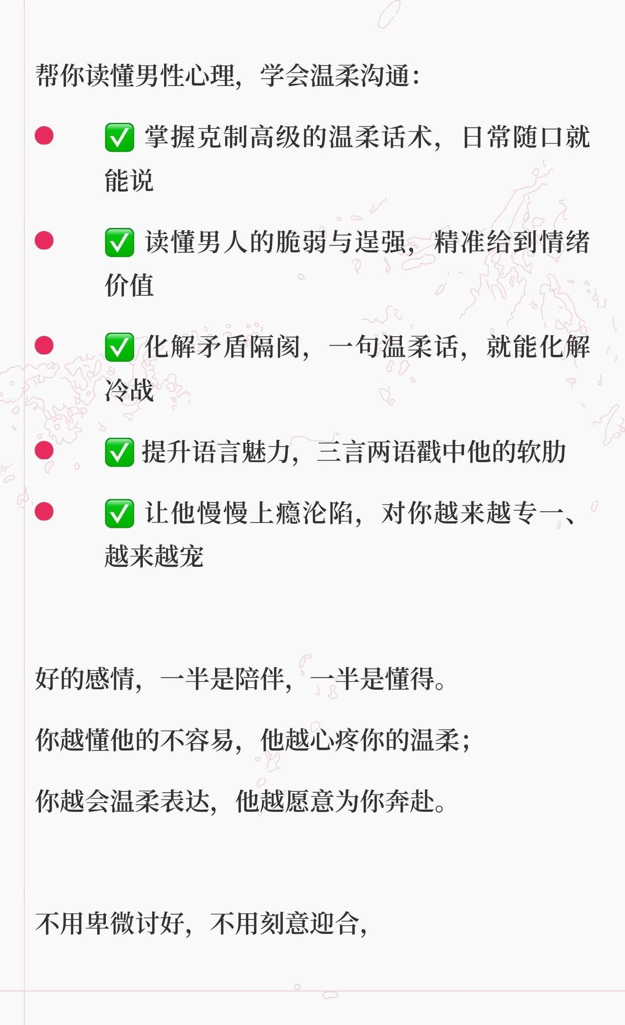 真正打动男人的是温柔、走心的真心话,而非浮夸的情话。男人需要被理解、被看见和被心疼,一句恰到好处的温柔情话,能治愈疲惫,满足柔软,让他心软、沦陷。学会共情表达,才能让感情升温,赢得他的偏爱。亲密关系 女性成长 先爱己再爱人 情绪稳定 大女主思维 两性相处之道文字复兴单元 RED新生代创作大赛