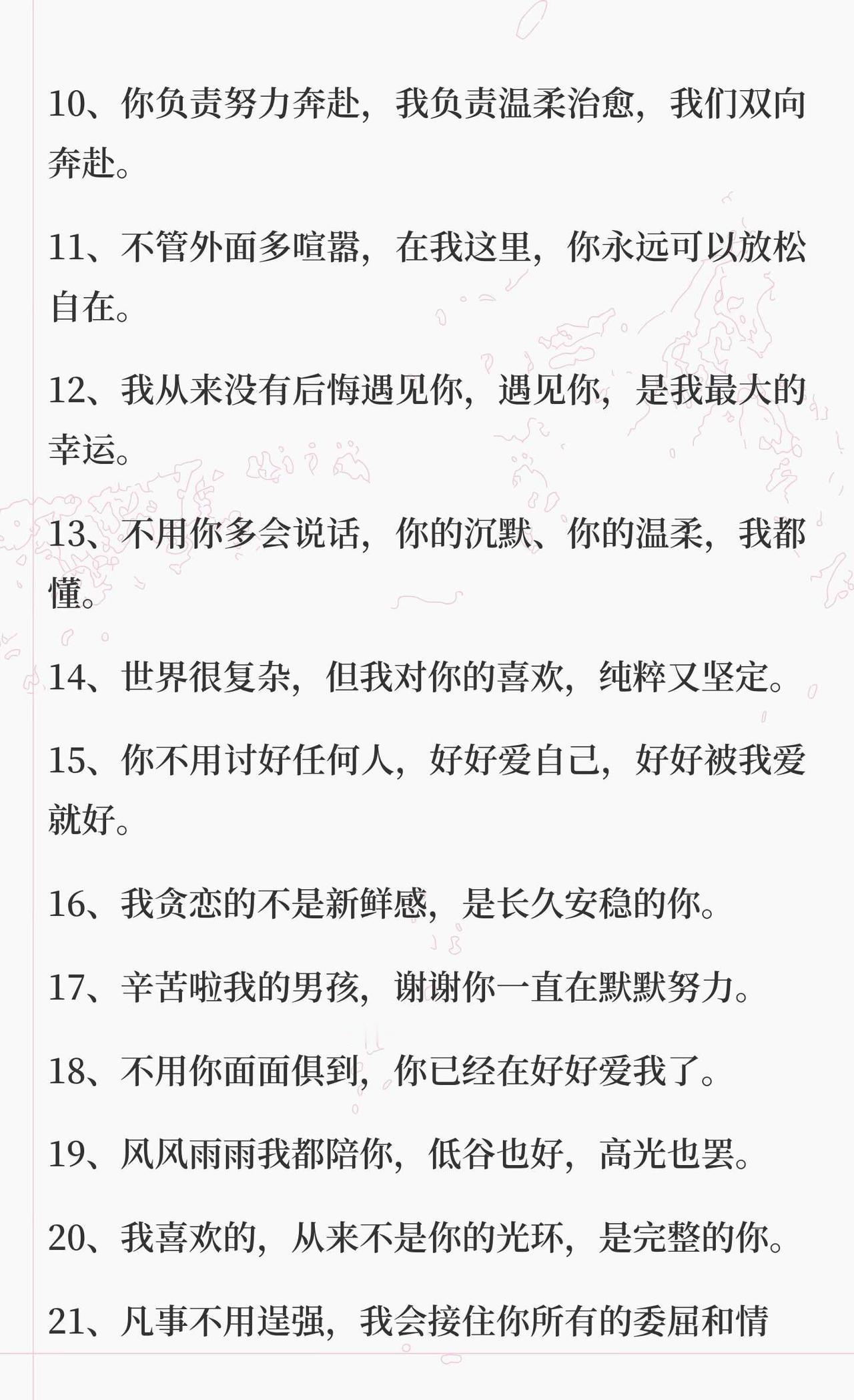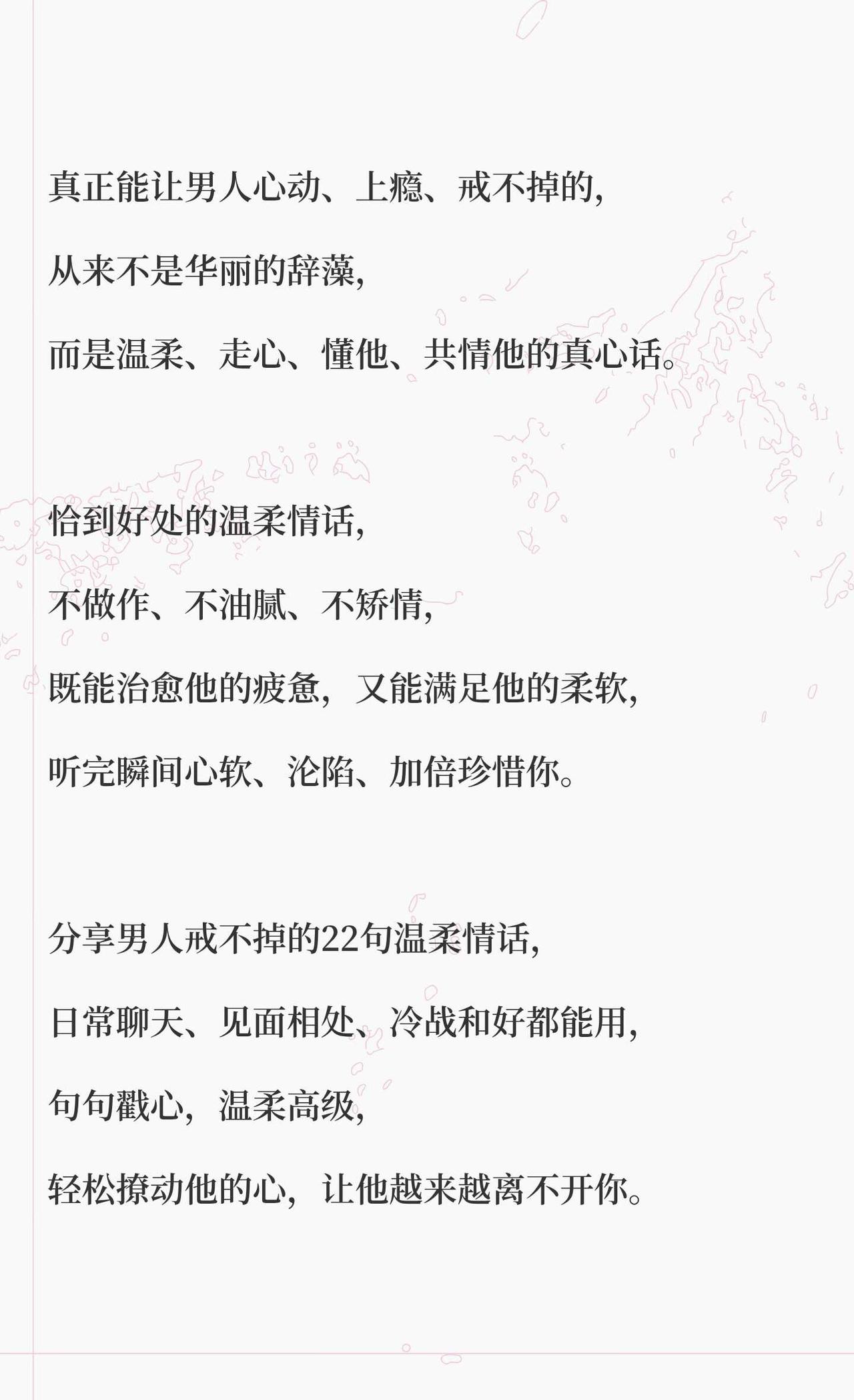 男人戒不掉的22句温柔情话 真正打动男人的是温柔、走心的真心话,而非浮夸的情话。