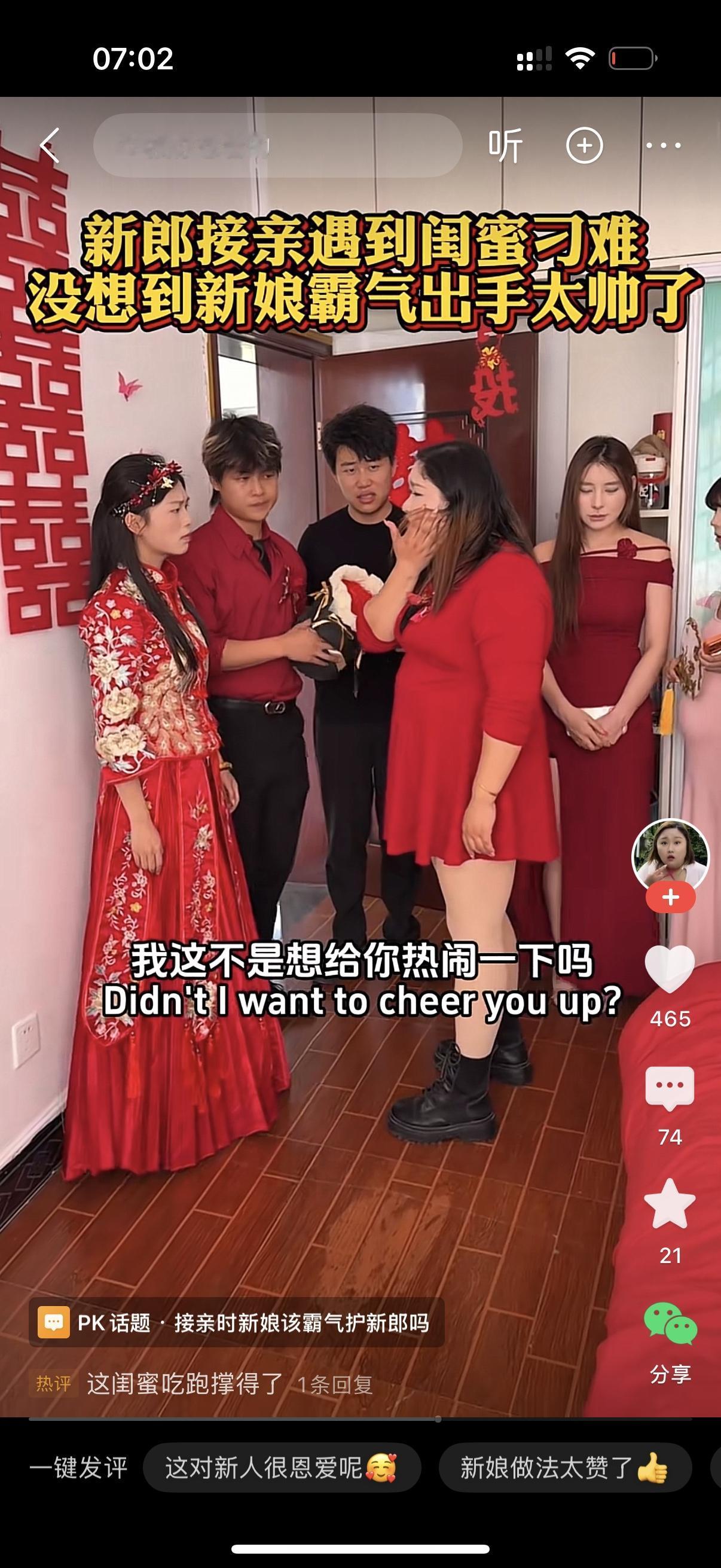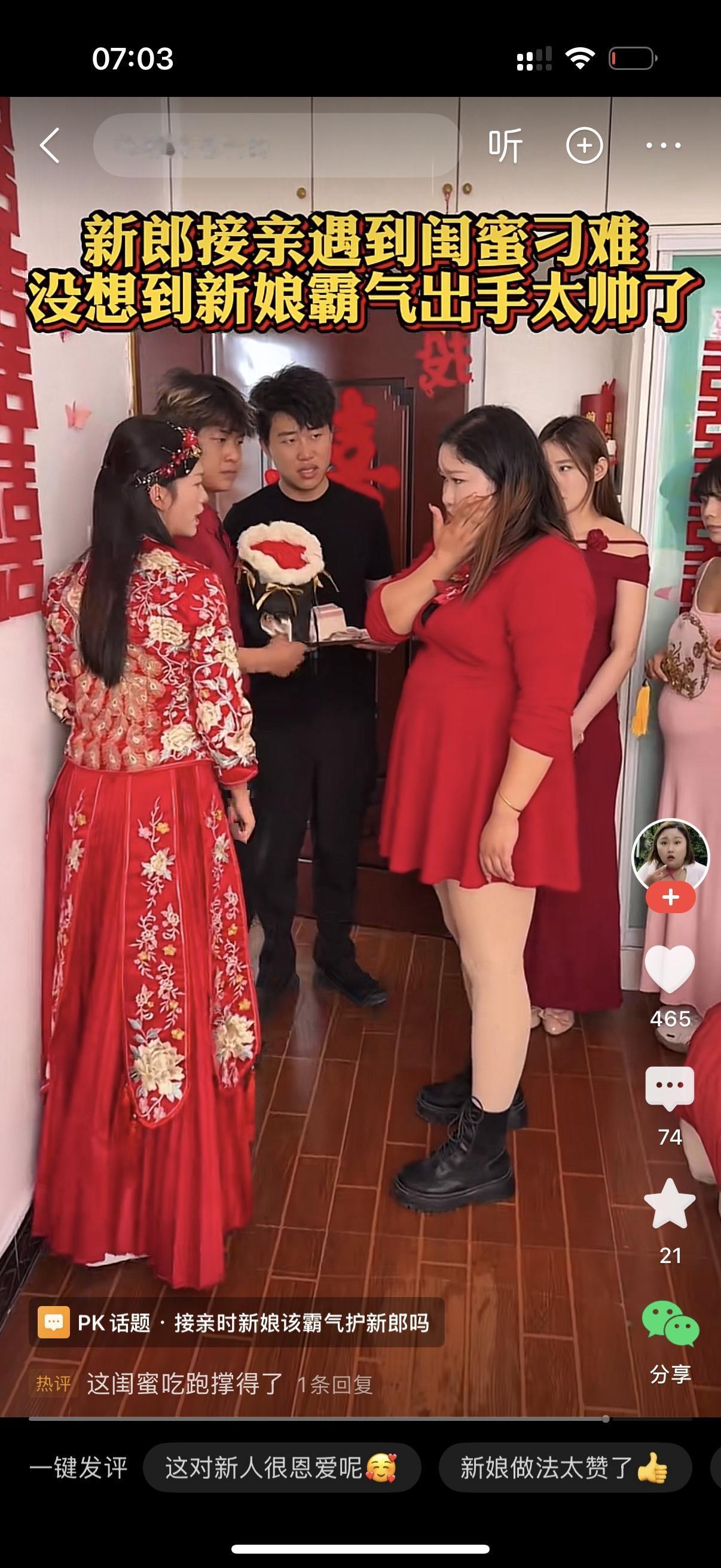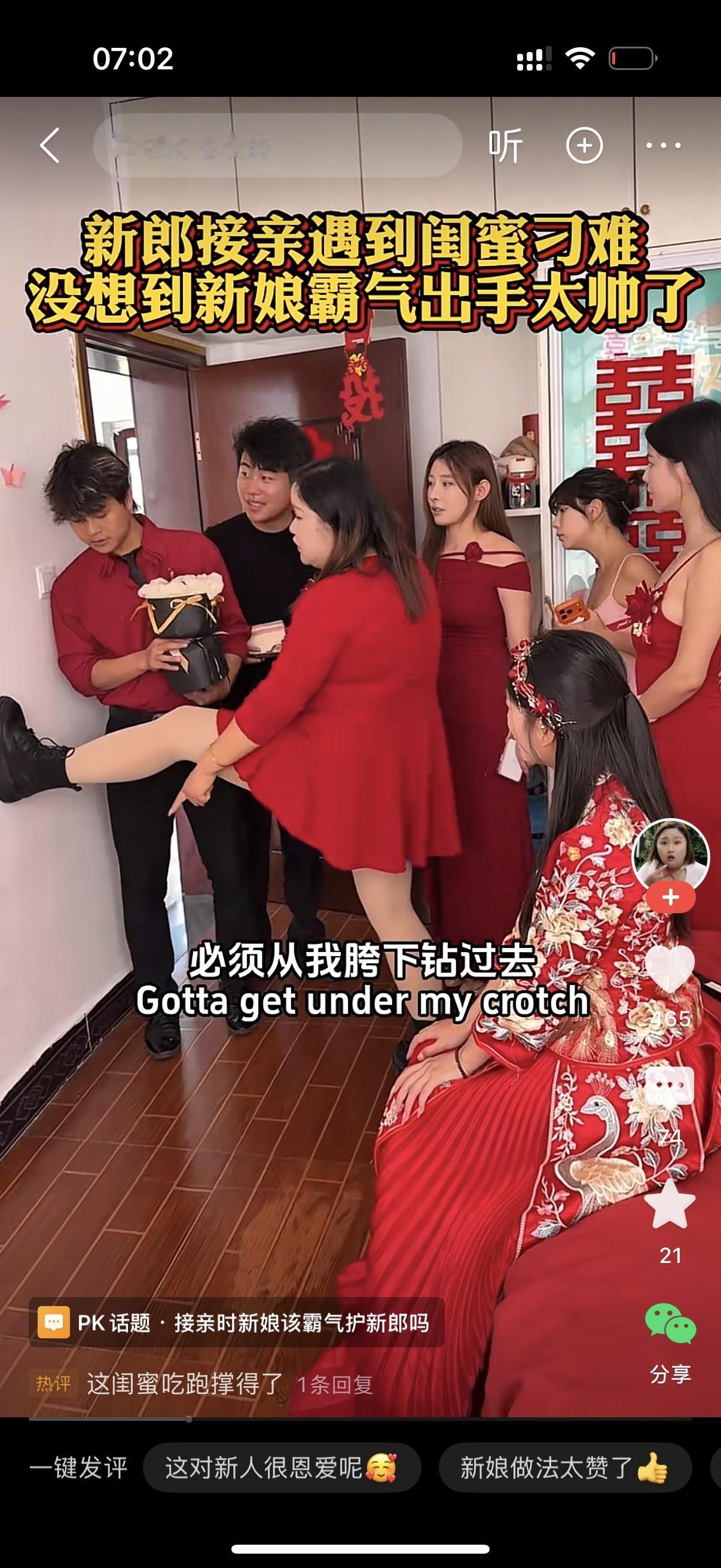 新郎推开门来接亲。一个伴娘拦住他说,等一下,今天你娶的是我闺蜜,必须从我胯下钻过去。新郎接亲心切,正打算钻。新娘阻止他,对着闺蜜就是一耳光,怒吼,你是来当伴娘的还是来侮辱我老公的?你结婚时想让谁钻就谁钻,我老公肯定不钻。从今往后,我没你这个闺蜜。伴娘委屈地说,我不就是想给你热闹一下吗?