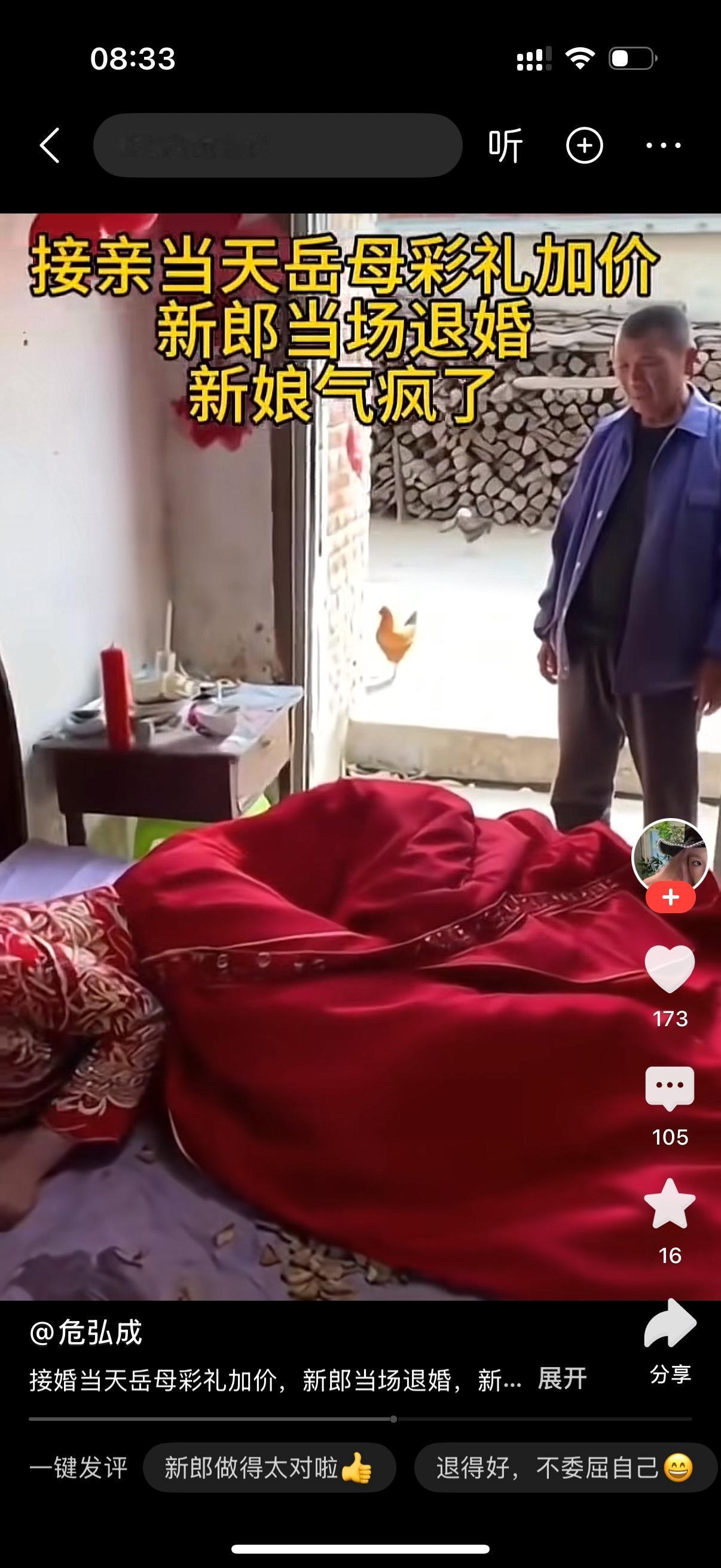接亲当天岳母加价彩礼,新郎当场退婚。新娘回到家躺在床上默默地哭泣。床上瓜果洒落一床,新娘气疯了。父亲站在旁边静静守候,生怕闺女想不开。新娘的母亲此时还在新郎家大吵大闹,骂对方没良心,毁了自己女儿一生一生的幸福。这个母亲不知道毁女儿一生的不是男方,而是她自己,她自己的贪念。