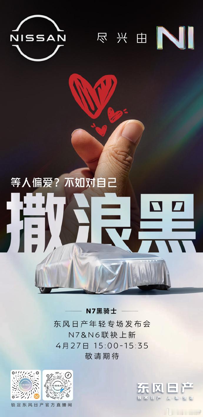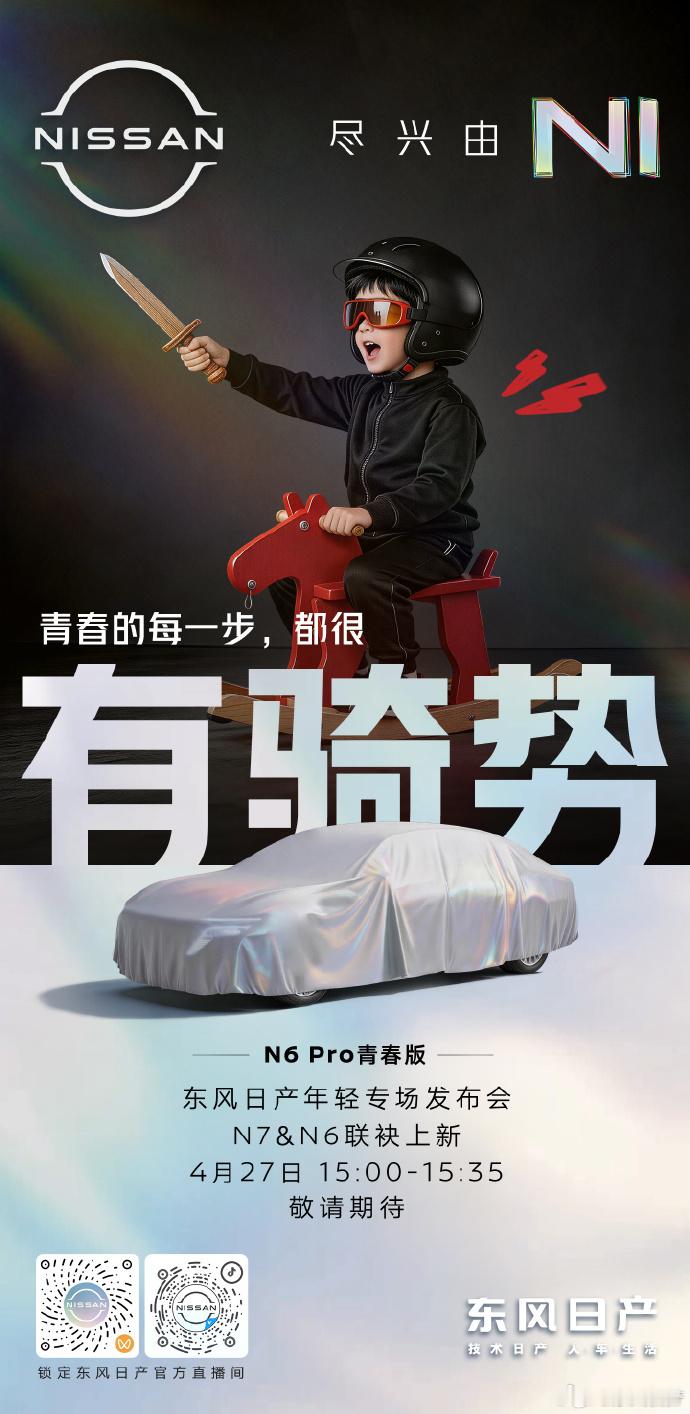4月27日15:00,东风日产举办年轻专场发布会,N7与N6联袂上新,推出黑骑士与青春版两款风格车型,潮酷造型亮点十足,静待正式登场。东风日产N7东风日产N6爱你老己青春骑士东风日产