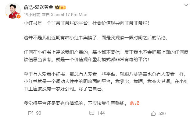 追觅CEO俞浩称小红书是烂平台【俞浩称小红书是一个烂平台】俞浩称小红书算法有意推荐做恶4月26日,追觅 CEO俞浩发微博称“小红书是一个非常非常烂的平台!社会价值观导向非常非常烂!