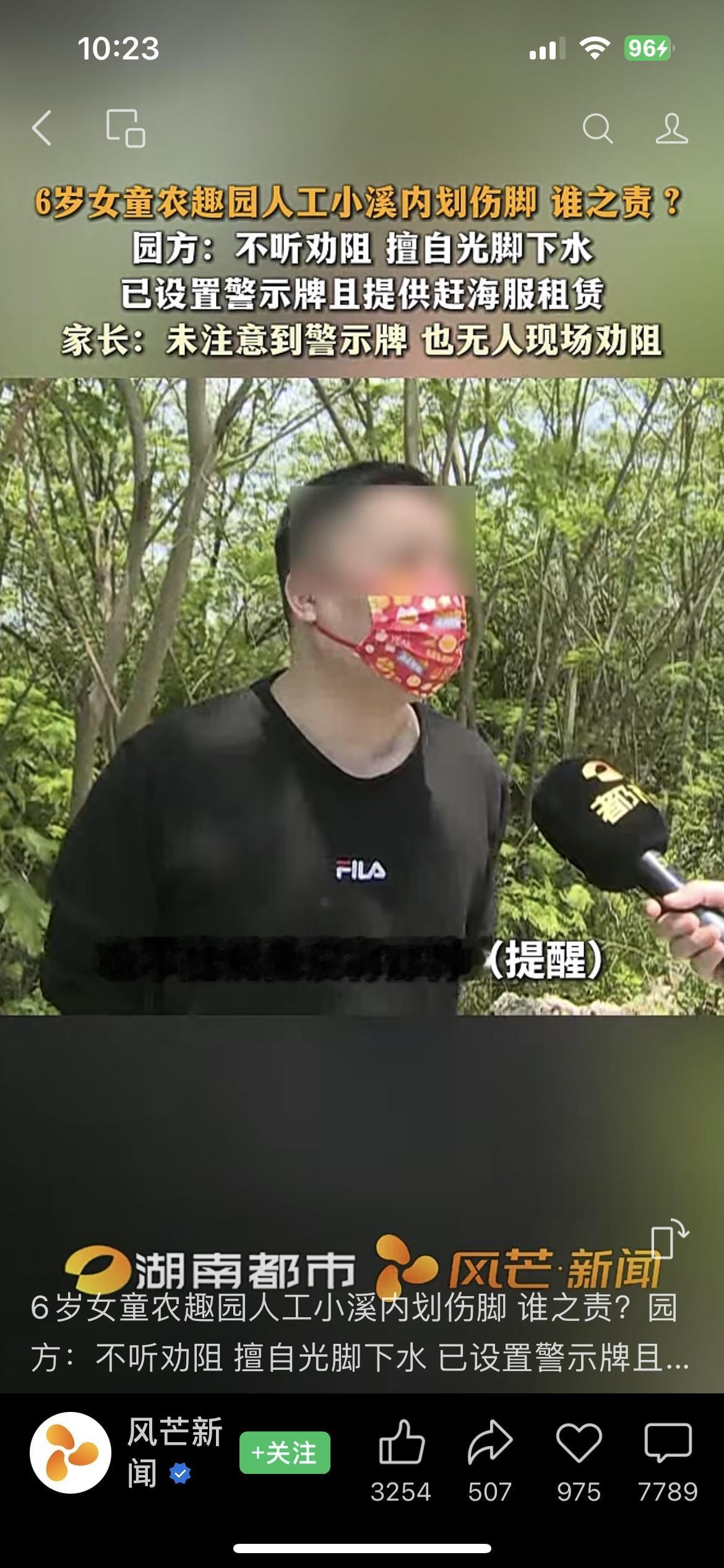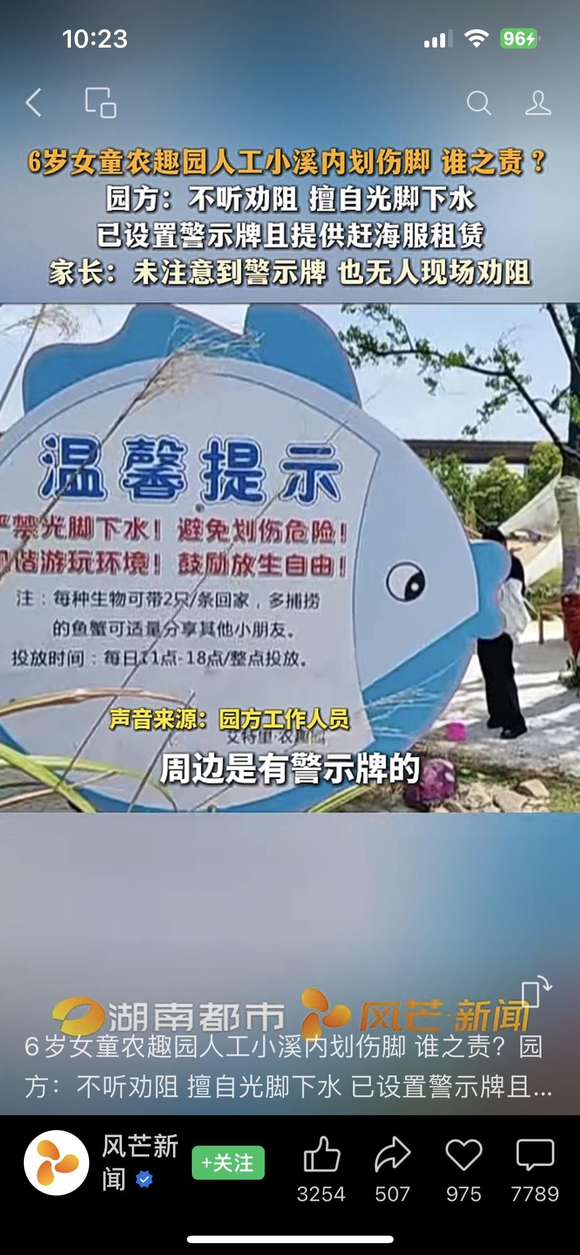6 岁女童农趣园光脚下水受伤,家长找老板扯皮索赔。明明小溪沟旁边就有禁止私自下水的告示牌。家长却说没看见,下水的时候没有工作人员前来阻止。景区该做的安全警示已经做到位了,不可能再加个盖子来做防护。小孩不懂,难道大人也装真眼瞎吗?在湖南的这个农趣园,老板一脸的委屈,小溪沟是开放给游客玩的,但是需要做好防护才能下水,不能光脚,因为水下存在各种尖锐的石头,容易划伤脚。他们没有那么多工作人员一一进行劝阻,只能用高音喇叭进行循环提示,可以说做足了安全提示。这些个家长只顾玩手机,根本没有照看好孩子,现在出了问题就怪天怪地怪水,却不会反思自己的错误。