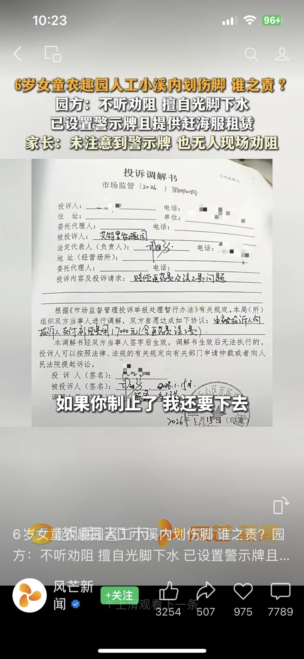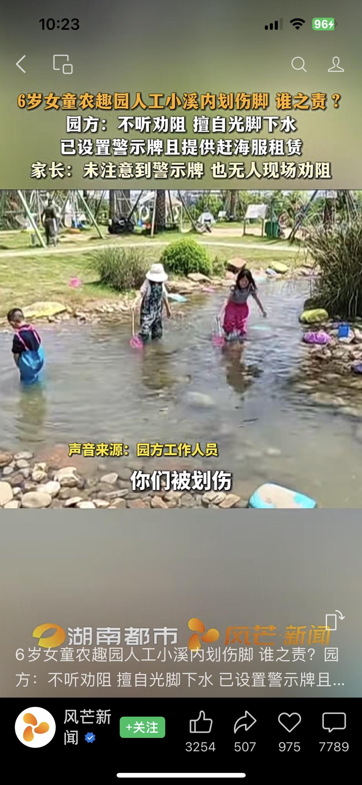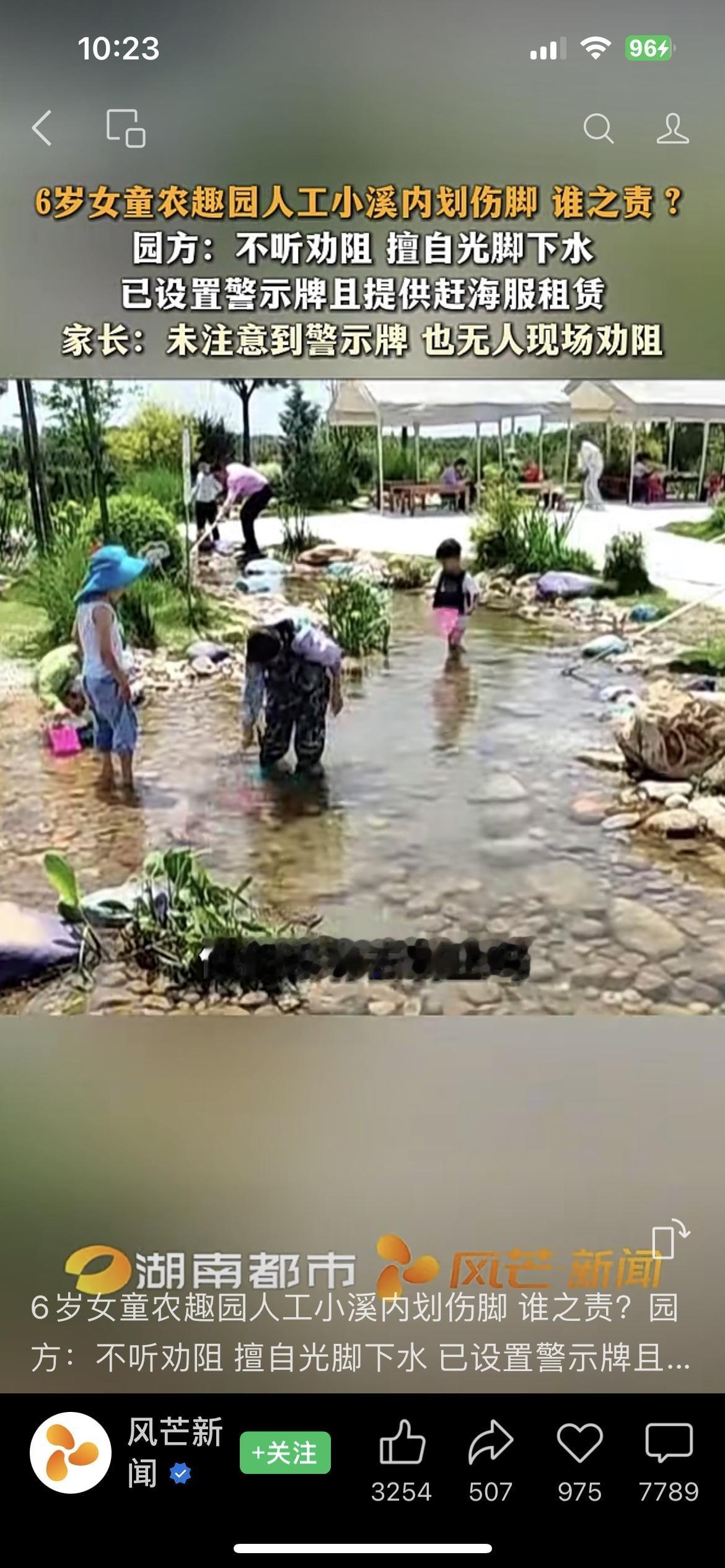 6 岁女童农趣园光脚下水受伤,家长找老板扯皮索赔。明明小溪沟旁边就有禁止私自下水