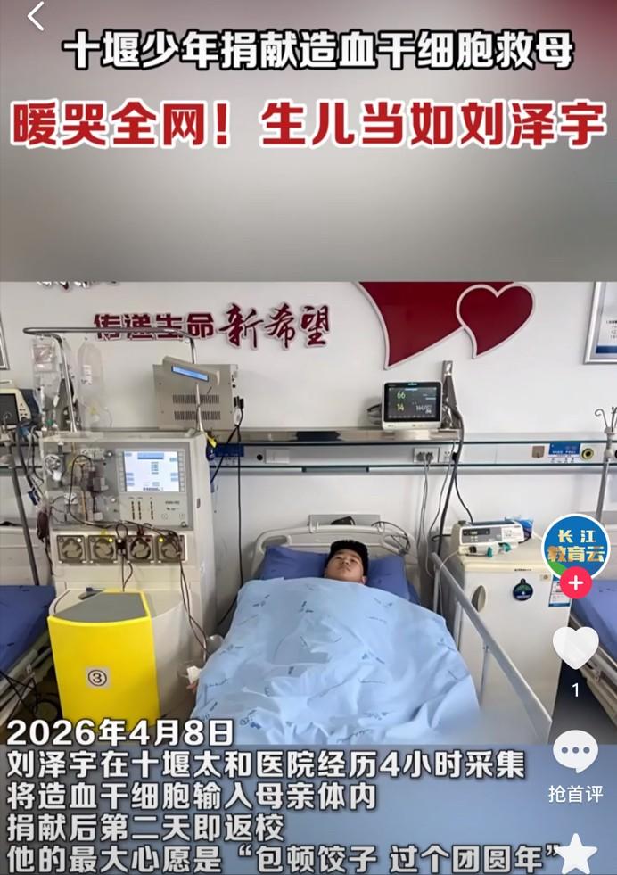 参考信息:央视网.(2026-04-20).为救母16岁少年捐献造血干细胞。央视网人物频道.央视网人物频道