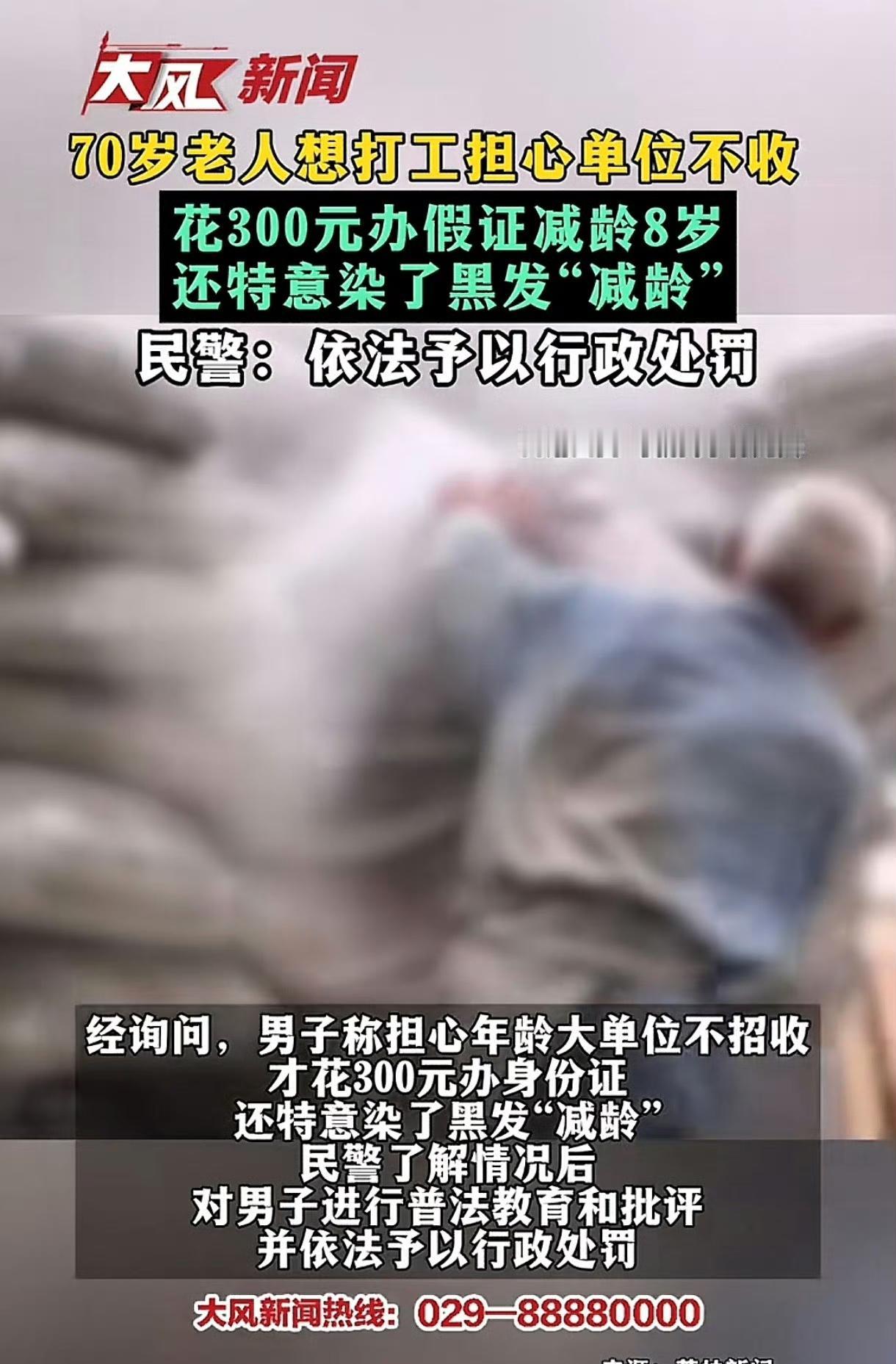 江苏句容 70 岁大爷办假证去打工,还特意染了黑头发,去派出所办务工证明露馅。大爷道出了自己的心酸和无奈,他虽然 70 岁,但是身体硬朗,家庭普通,没有退休金,子女经济一般,没法给他生活上的支持。大爷想去打工,无奈 70 岁成了用人单位无法逾越的红线。大爷灵机一动花 300 办了个假身份证,把年龄改小了 8 岁,还特意染了一头黑发,看起来更年轻,却没想到在派出所露馅,因此遭到了处罚。这真是一个现实的困境,很多有劳动能力却年龄大的老人,没有退休金,靠不上子女,日子真的会非常的煎熬。