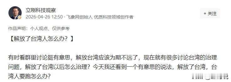 [浮云]4月26日项立刚发文称看到一个有意思的说法,解放了台湾,台湾人要跑怎么办?