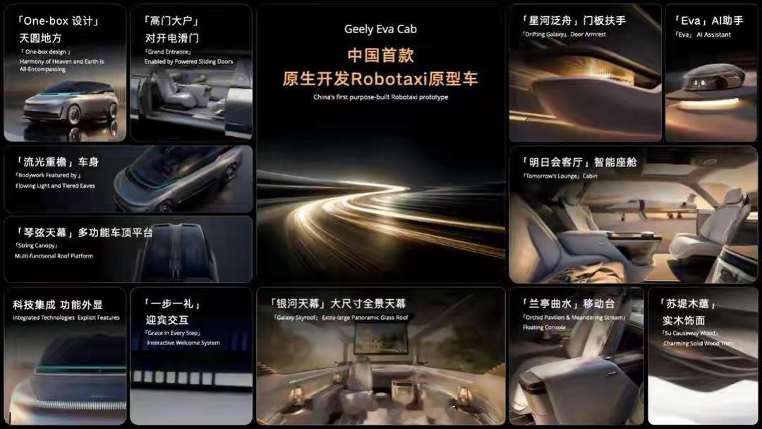 对了还忘了说了前几天去车展吉利展台上也直接甩出重磅硬货,拿出了咱们中国第一款原生打造的Robotaxi原型车Eva Cab。简单说,这就是一台能自己跑、不用司机的智能出行机器人,靠着吉利全新全域AI 2.0全套黑科技,直接把未来出行搬到了眼前。