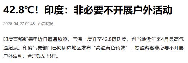 印度最近被高温烤懵了,就在25号那天,萨夫达尔忠格气象站测出来的最高温度,居然达到了42.8摄氏度。