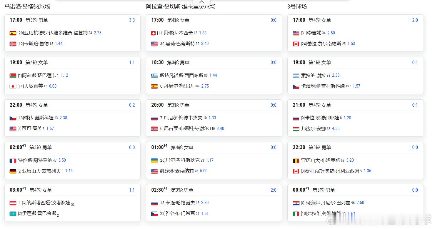 19点萨巴伦卡vs大坂直美22点诺斯科娃vs高芙3点半左右莱巴金娜vs波塔波娃