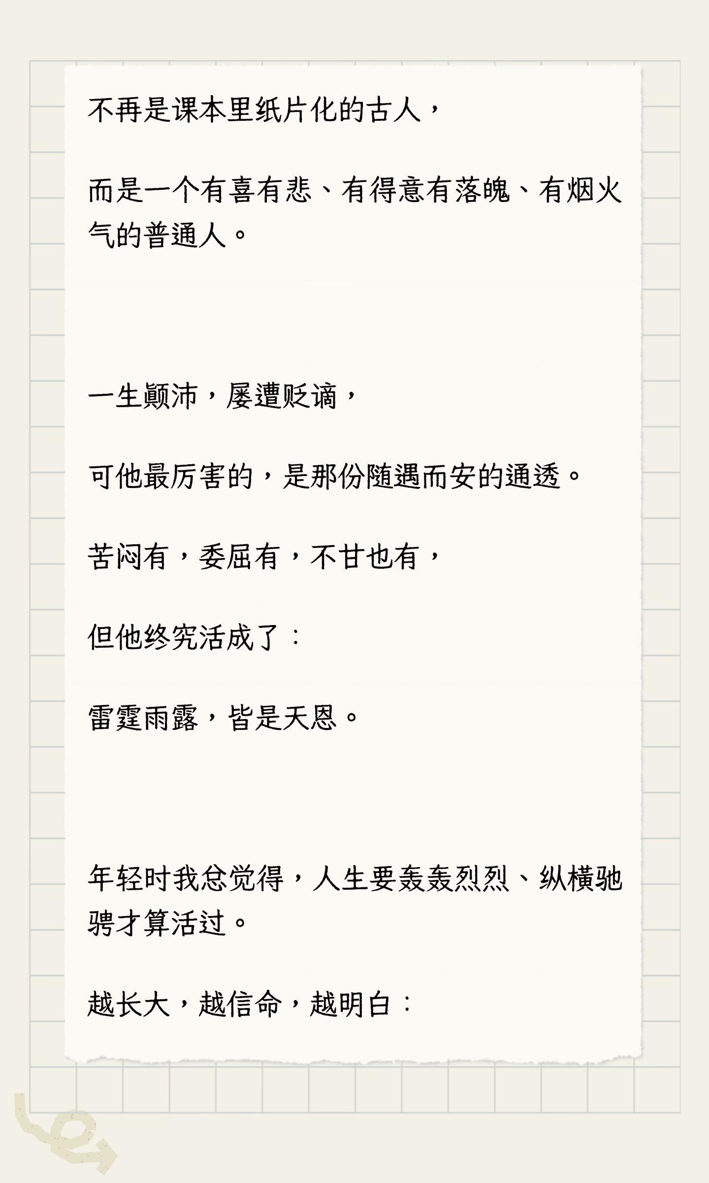 代入苏轼的视角后什么都懂了人这辈子多读苏东坡,才算看懂生活真相。一生颠沛屡屡受挫,受尽世事磋磨。但从来不钻牛角尖,低谷不消沉,顺境不狂妄。真正厉害从来不是一路顺遂,是被生活敲打过后,依旧温和通透,从容过日子。