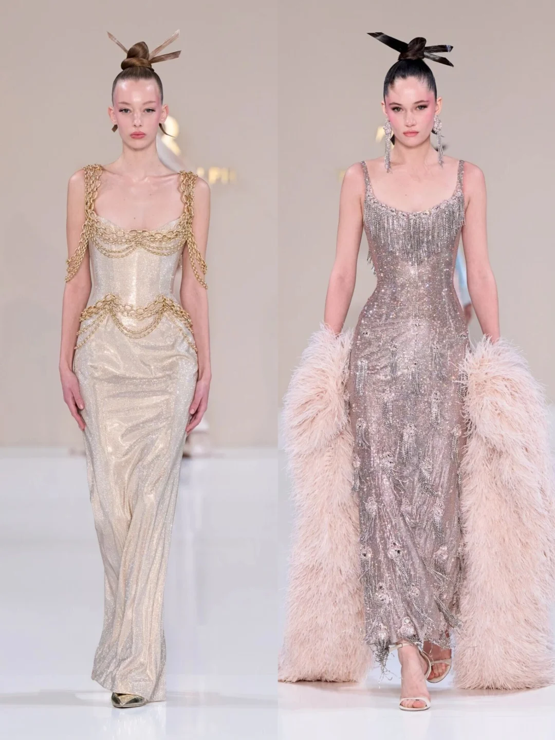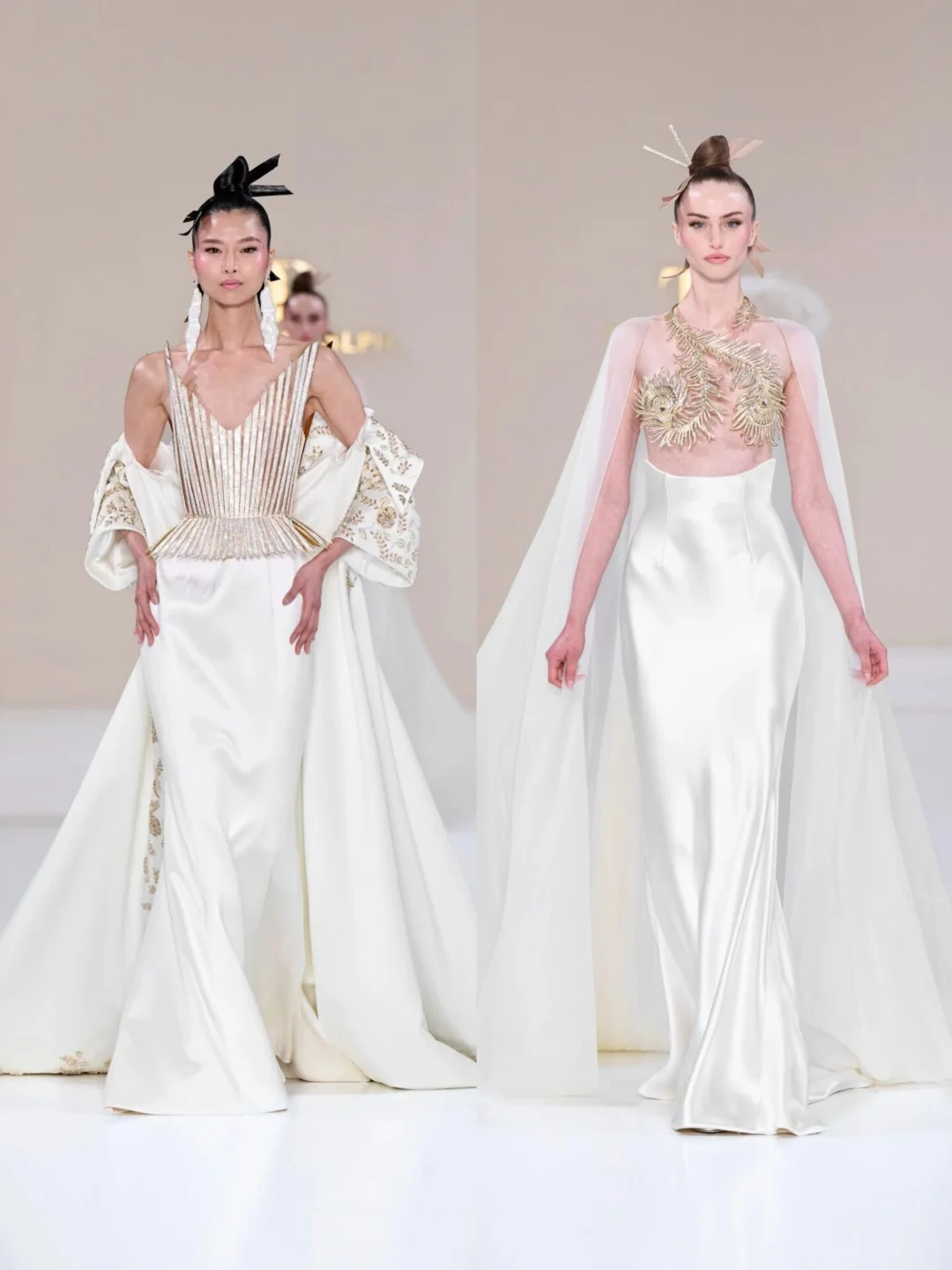 标志性的沙漏腰设计。以香槟色、裸粉、浅灰等柔和色调为主色调 。采用丝绒、薄纱等材质,结合手工刺绣与钉珠工艺,在光线下呈现星轨般的流动美感~