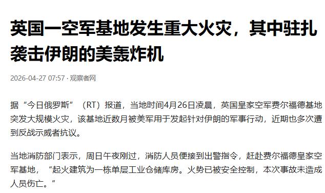 当地时间4月26号凌晨,英国那个费尔福德皇家空军基地,突然就燃起了大火,火势还不小,整个基地都被浓烟罩着。