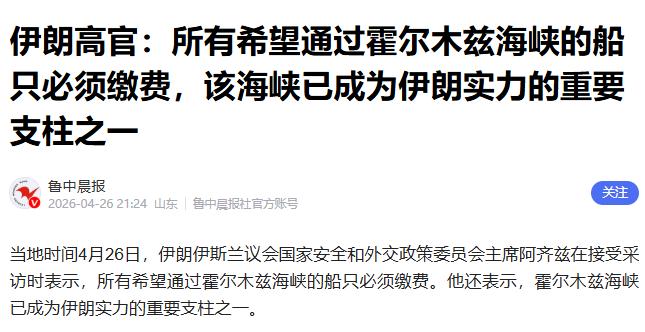 4月26日,伊朗议会高官阿齐兹公开表示:“所有希望通过霍尔木兹海峡的船只必须缴费,霍尔木兹海峡已成为伊朗实力的重要支柱之一”