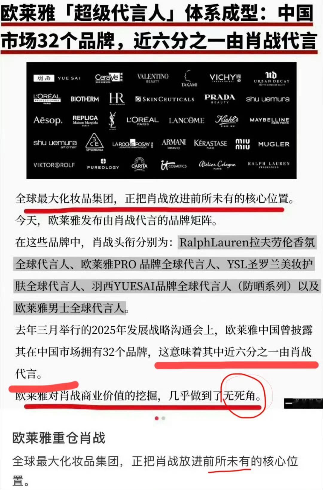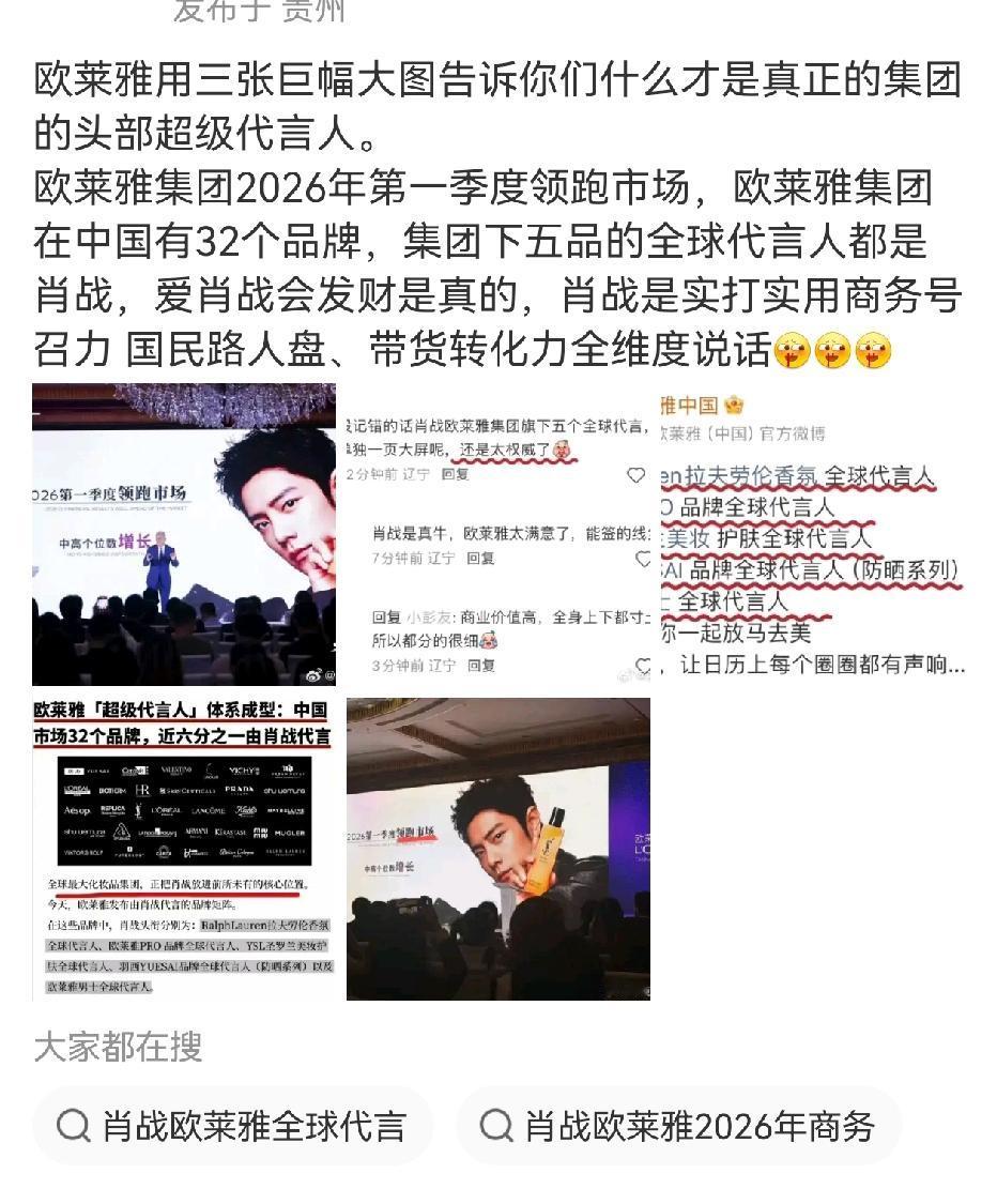 欧莱雅集团2026年一季度领跑市场,集团大会上放出的是肖战的照片。 欧莱雅集团在中国有32个品牌,而其中近六分之一品牌的代言合作都是肖战的。 今天我的欧莱雅pro到了~才发现我囤的还有5大瓶没开封[呲牙]
