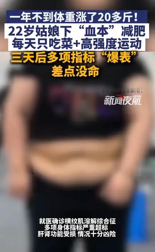 “悲剧还是发生了!”4月27日报道,浙江,一女子毕业一年不到,体重就涨了20多斤,她为了快速瘦身,每天只吃蔬菜,还进行高强度训练,结果坚持了几天,她就出现了乏力恶心的症状,尿也变成酱油色,最后被紧急送往医院!医生:横纹肌溶解症!