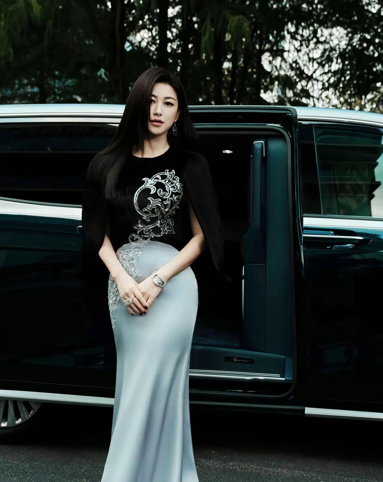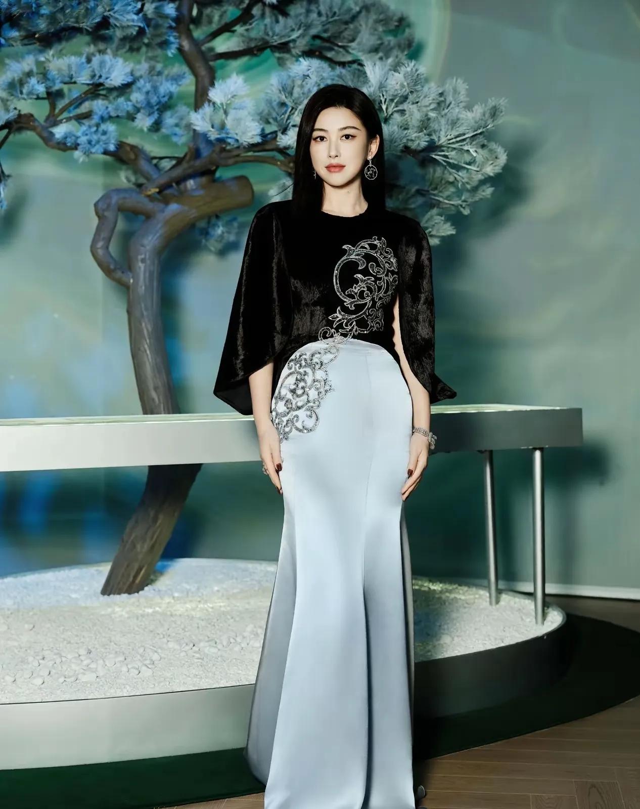 黑色丝绒斗篷上衣搭配银线刺绣,复古又显贵;浅灰缎面鱼尾裙勾勒曼妙曲线,走动间摇曳生姿。东方贵气与现代时尚完美融合,妥妥的气质天花板!