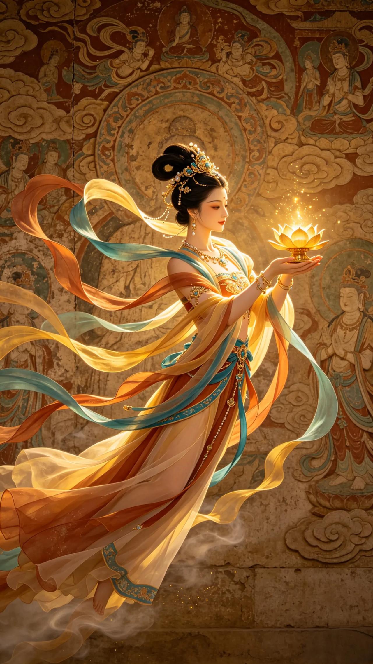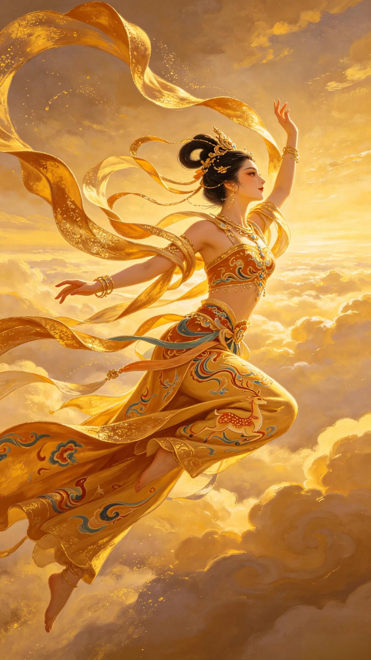 AI还原的敦煌飞天壁纸,将东方古典艺术之美展现得大气又惊艳,壁画质感厚重,金色光影华丽,细节满满。