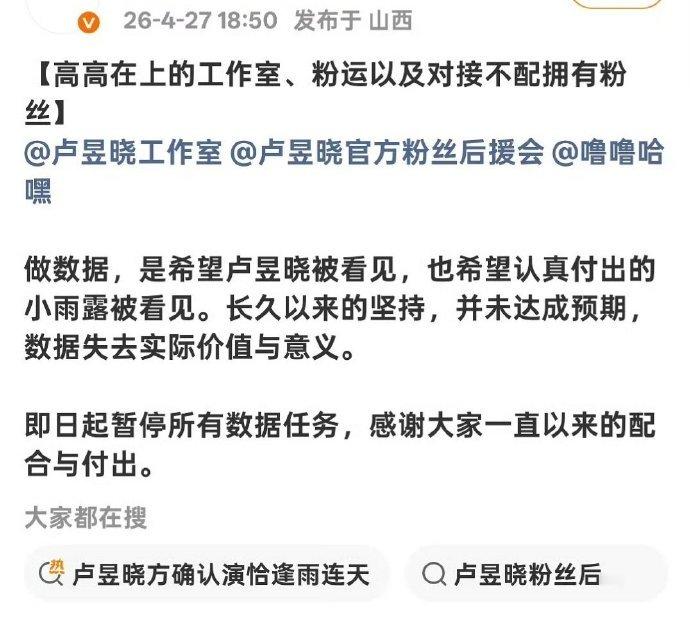 卢昱晓官方后援会、反黑站、网宣组、线下应援组全部暂停活动,永拒《恰逢雨连天》 .