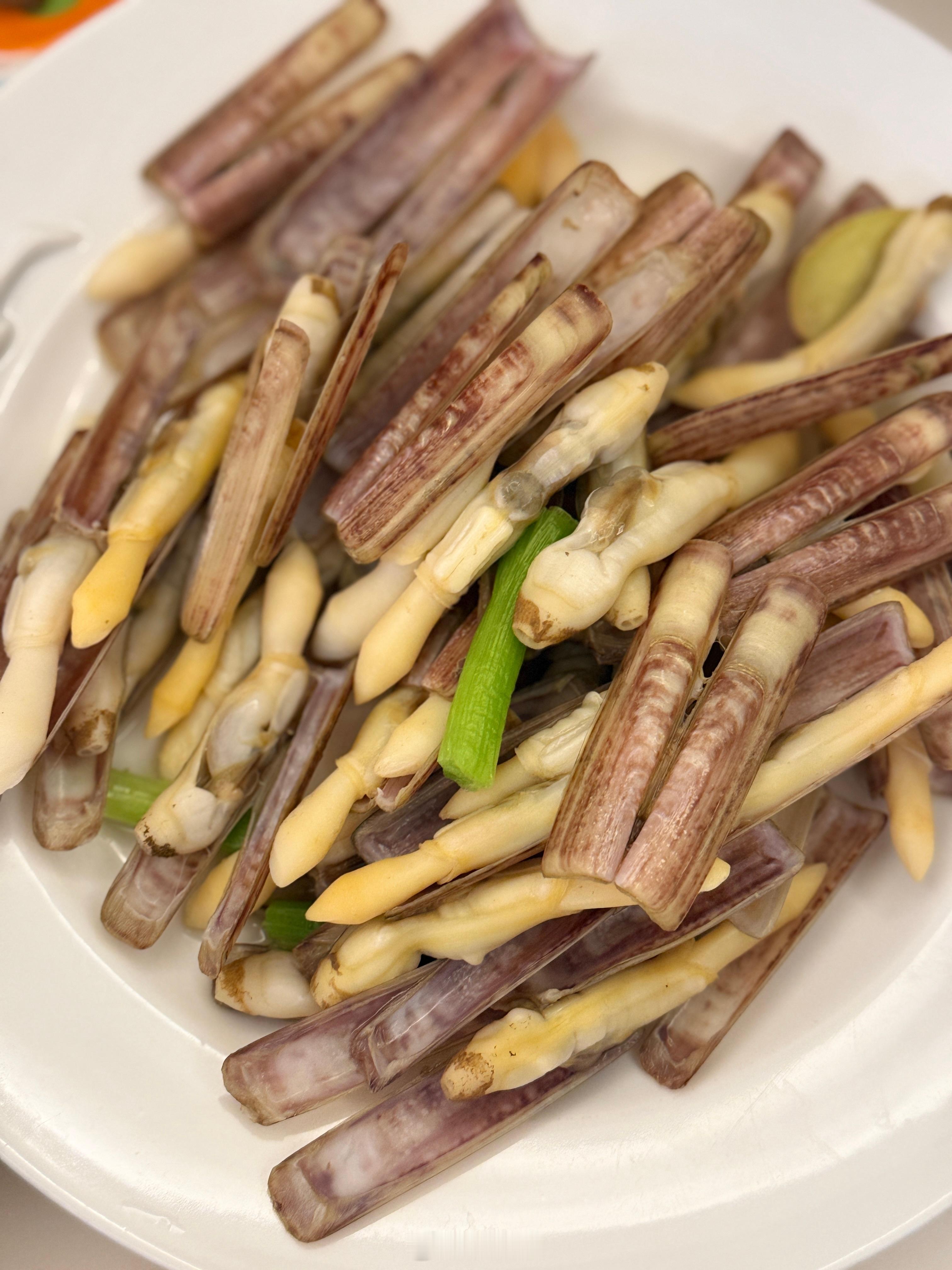 吃饭了白水捞竹蛏、几乎无油的番茄炖排骨、炒菠菜、几乎无油的茄子、看不到半点油花的