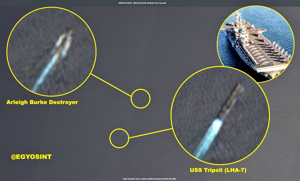 🔻今日,美国海军"的黎波里"号两栖攻击舰(LHA-7)在阿曼海岸约 100 公里处的阿拉伯海与一艘阿利·伯克级驱逐舰协同行动(图1-2)。🔻坐标:21.00916,60.37561🔻同时,4 月 26 日还观测到"亚伯拉罕·林肯"号航空母舰在附近活动,位于"的黎波里"号(LHA-7)以北约 130 公里处阿拉伯海航行,由两艘阿利·伯克级驱逐舰护航。🔻坐标:22.12731, 61.05991(图3-4)🔻来自欧洲的哨兵2号卫星。轰炸中伊朗国宝来到中国美国已收到伊朗谈判新方案海外新鲜事中东现场直击