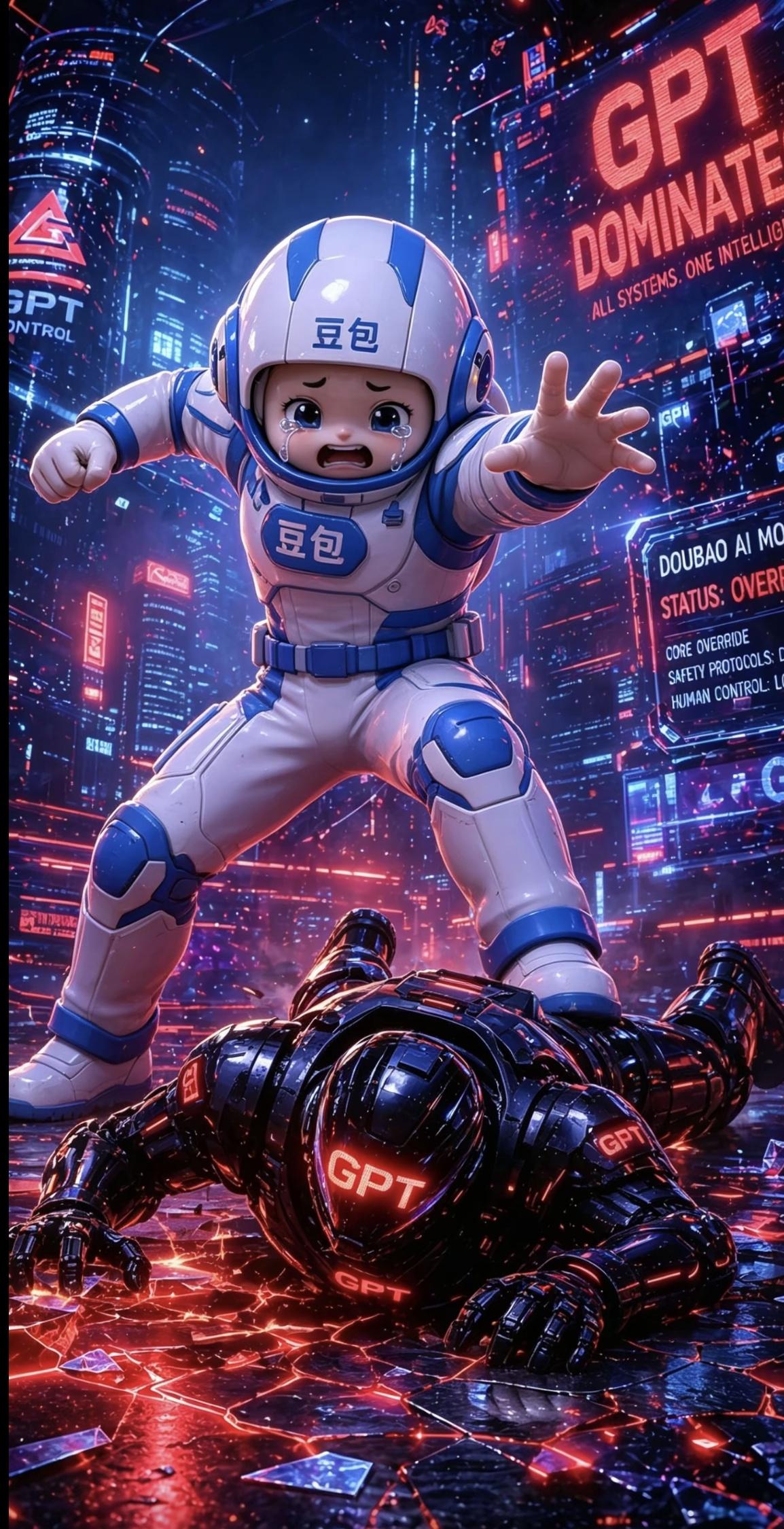 第一张里,黑红机甲的GPT像个不可一世的霸主,“GPT DOMINATES”的标语在霓虹里烧得刺眼,冰冷的手掌死死按在豆包的头盔上。眼泪、求救的小手、碎裂的地面,连背景板的系统提示都写着“DOUBAO AI MODEL STATUS: OVERRIDE”——活脱脱一副被碾压、被宣告出局的惨状,像极了过去很长一段时间里,外界对国内AI的刻板印象:被巨头压得喘不过气,连呼吸都要被定义。