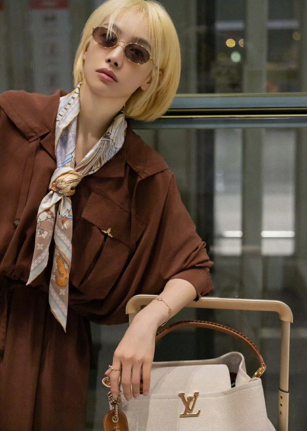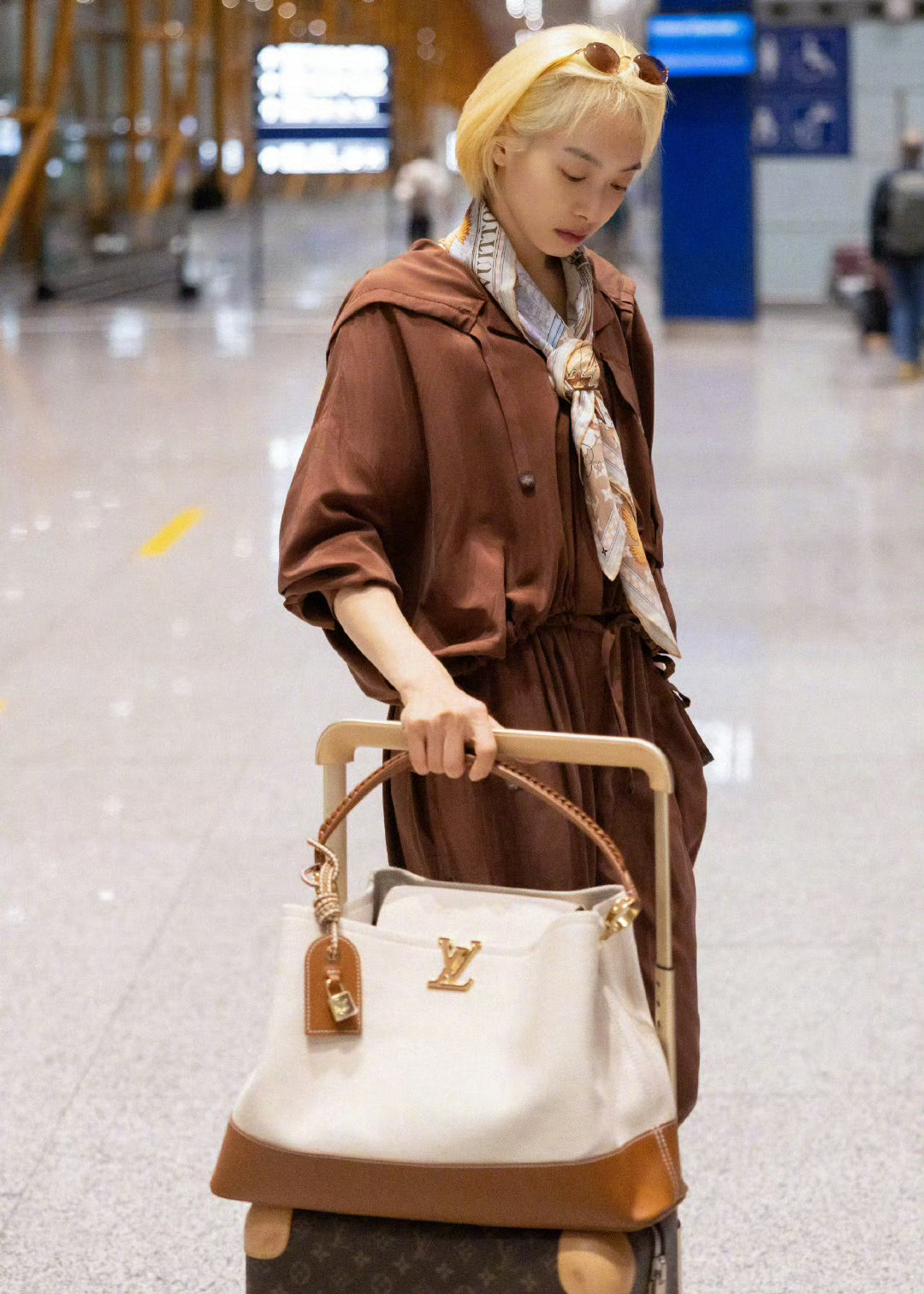 宋茜身穿全套LV启程前往摩洛哥,将亮相LV高珠活动。金色短发配搭棕色系套装,舒适又随性的飞行style。 宋茜金发老钱风机场造型